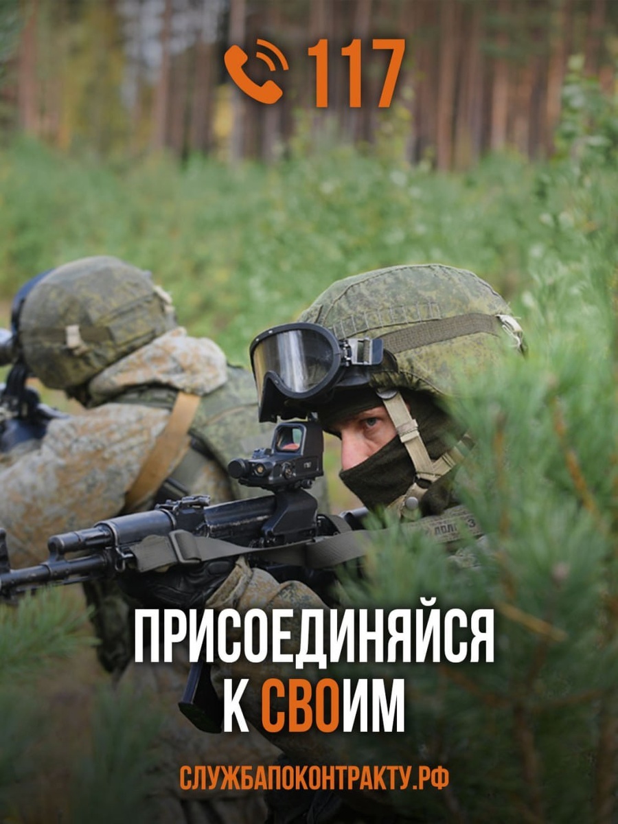 Вступай в ряды настоящих патриотов, присоединяйся к СВОим! ➡️ Чтобы поступить на военную службу по контракту, нужно обратиться в пункт отбора на военную службу (https://clck.ru/3CW3MK)или военкомат (https://clck.ru/3CW3Pp) по месту жительства. Подать заявку можно через единый портал государственных услуг (https://contract.gosuslugi.ru/) или сайт Минобороны России (https://clck.ru/3CW6TK). ❕ Подробности на сайте http://www.krskstate.ru/voen_kontrakts и по телефону 117, военкомат 8(39145)6-31-72 и пункт отбора 8-950-405-38-86.