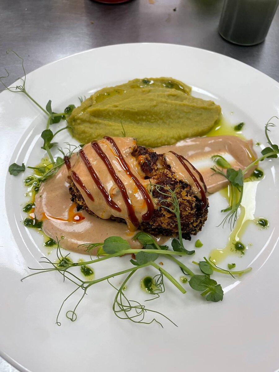 Котлета из капусты с горошковым пюре ,под соусом кокос-барбекю