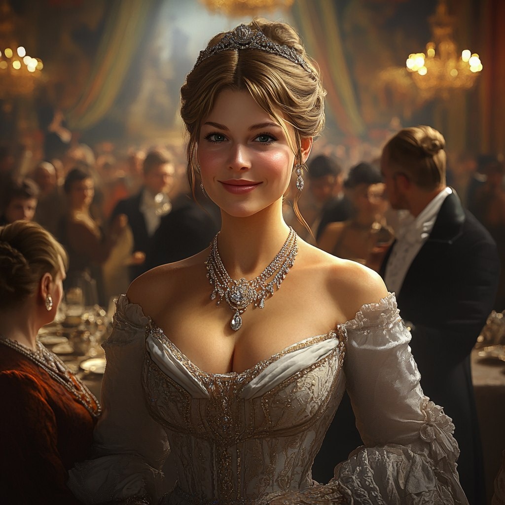 Создано на основе запроса: A regal woman inspired by Josephine Bonaparte standing confidently at a grand ball. She wears an elegant dress and a glittering diamond necklace, surrounded by noble guests. Her expression is proud and slightly smug. Dramatic lighting, photorealistic, 8K resolution. --- Автоперевод: Регальная женщина, вдохновленная Джозефина Бонапартой, уверенно стоящей на великом мяче. Как тебе это изображение? 🤔 https://dzen.ru/id/65c0c65c86e4f837c27b24d7 #ИИ #AI #нейросеть #midjourney #art