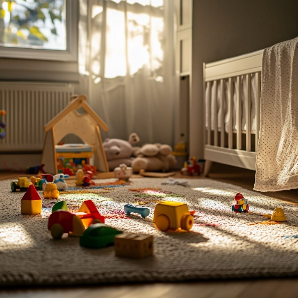 Создано на основе запроса: Toys scattered naturally on the floor in a softly lit nursery