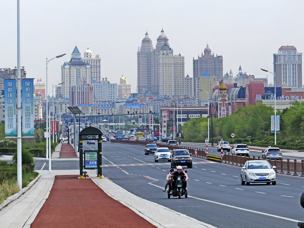 А Панда и Умка глядят на Пятую улицу - мощную транзитную ось, на западе переходящую в дорогу к границе, а на востоке - вглубь КНР. Здесь и архитектурное буйство Маньчжоули достигает апогея: