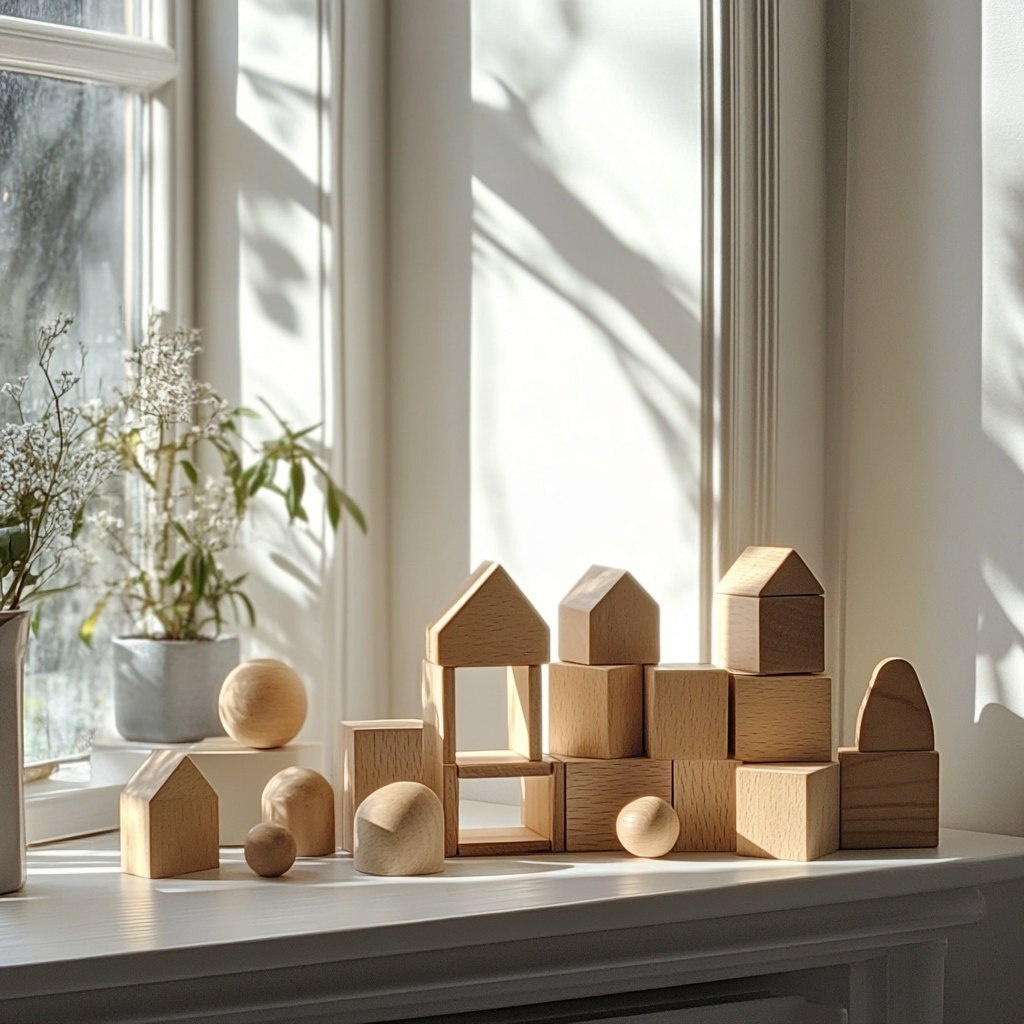 Создано на основе запроса: Wooden building blocks on a low shelf in a sunlit Scandinavian-style playroom