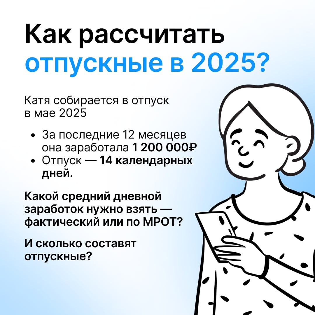 💵 2025: новые правила расчёта отпускных С нового года вырос МРОТ, обновились предельные базы — а значит, изменились и расчеты минимальных выплат. Разбираем на примере, как в 2025 году считать отпускные: что взять — фактический доход или МРОТ? 🤠 Вместо пересчета всех данных — выбирайте Saby. Сервис уже готов делать расчеты с новыми вводными. Поможет больше понять про изменения статья в нашем журнале. 🎓 Если вы только начинаете разбираться в расчётах или хотите систематизировать знания — обратите внимание на курс «Зарплата и кадры с нуля: от приема до увольнения». Всё по шагам, без лишнего, с актуальными нормами. А ответ на задачу уже ищите в опросах и пишите, что думаете про изменения ⬇️ 📱 Saby для бухгалтеров #Saby_Полезное #Saby_Журнал