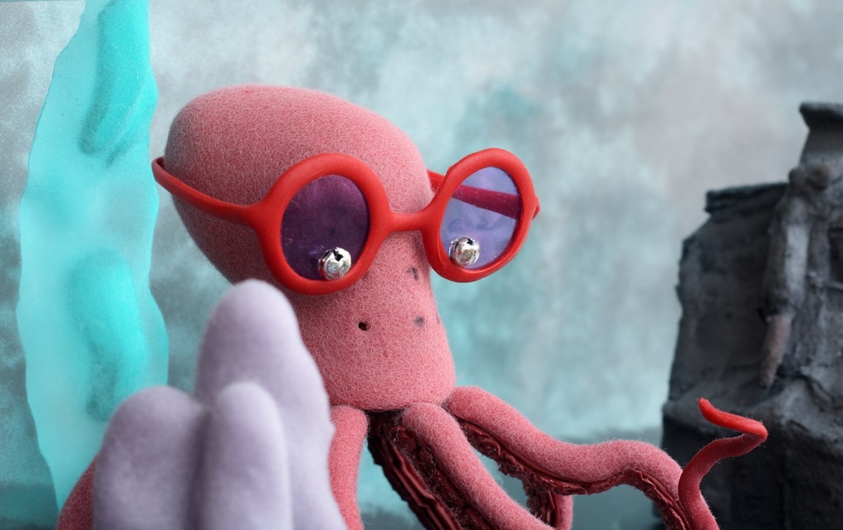 Создано на основе запроса: huge Shy robot-octopus in red spectacles exploring imaginary urban landscape made from plasticine, silver, felted