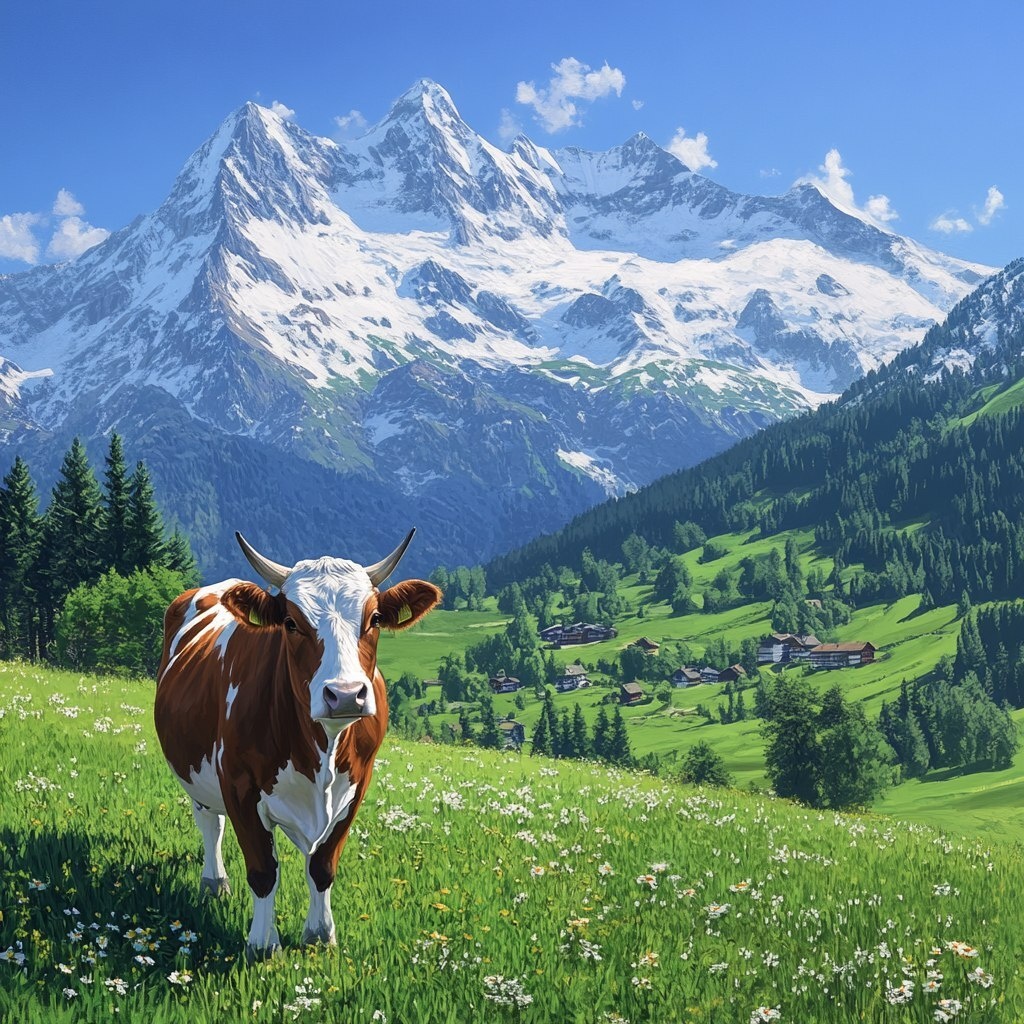 Создано на основе запроса: majestic view of the Alps, snow-capped mountains in the background, green meadows, a peaceful brown and white cow