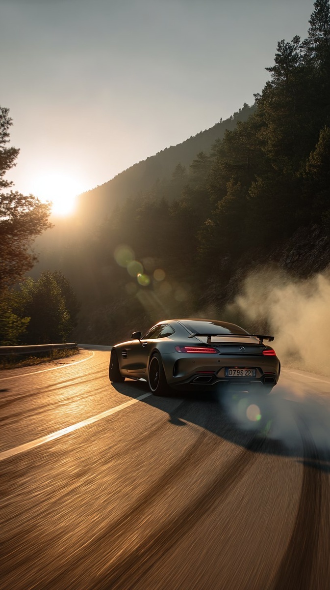 Создано на основе запроса: Mercedes AMG drifting on a mountain road at sunset, smoke and tire marks, long shutter speed, camera tracking the