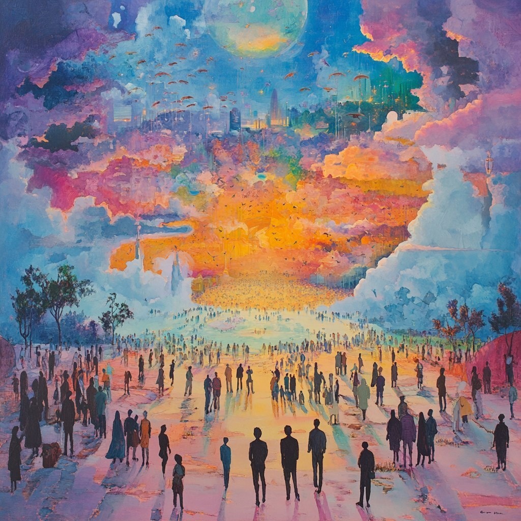 Создано на основе запроса: falsely realistic painting; mystical atmosphere between blue/purple and yellow/orange/pink; a large community of souls find themselves in an extraordinary and poetic universe --- Автоперевод: ложно реалистичная живопись; Как тебе эта генерация? 🤔 https://dzen.ru/id/65c0c65c86e4f837c27b24d7 #ИИ #AI #нейросеть #midjourney #art
