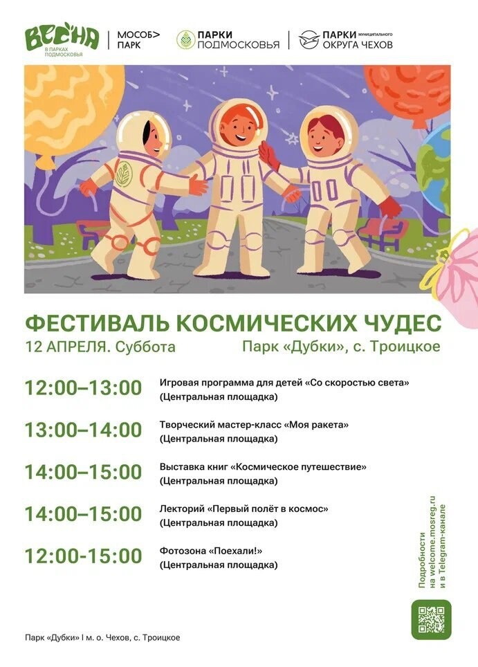 ✨ ФЕСТИВАЛЬ КОСМИЧЕСКИХ Чудес в парке Дубки ☄️12:00-13:00 Игровая программа для детей "Со скоростью света" 🚀13:00-14:00 Творческий мастер-класс "Моя ракета" 📚14:00-15:00 Выставка книг "Космическое путешествие" 📢14:00-15:00 Лекторий "Первый полет в космос" 📸12:00-15:00 Фотозона "Поехали" 🚫 Возраст: 0+ 📆 12.04.2025 🕛 12:00 🏢 Парк культуры и отдыха «Дубки» 📍 г.о.Чехов, с.Троицкое, парк "Дубки" 🪙 Вход свободный❗️ #webЧехов ✅ Мероприятия Чехов https://dzen.ru/id/66cc4b48e9ef144699238a51 http://vk.com/chekhov_events http://dzen.ru/chekhov_events