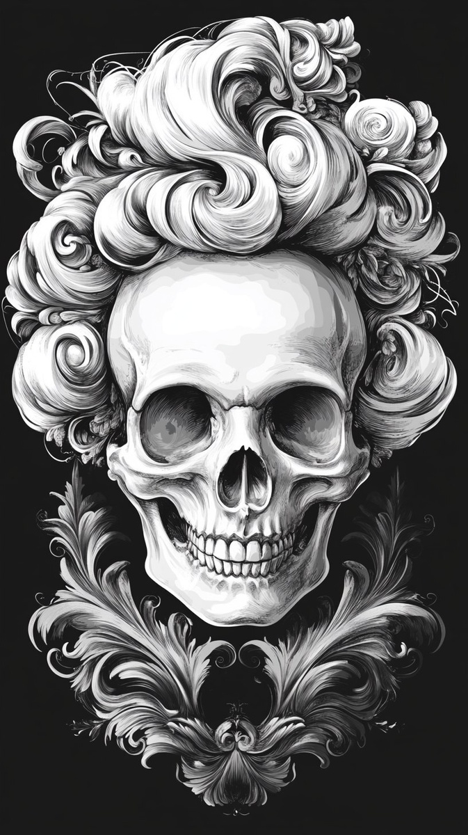 Создано на основе запроса: a vectorial black and white ornement skull with a ridiculous wig , baroque style, --- Автоперевод: векторный черно -белый орнамент череп с нелепым париком, стиль барокко, Неплохо выглядит? 🤔 https://dzen.ru/id/65c0c65c86e4f837c27b24d7 #ИИ #AI #нейросеть #midjourney #art