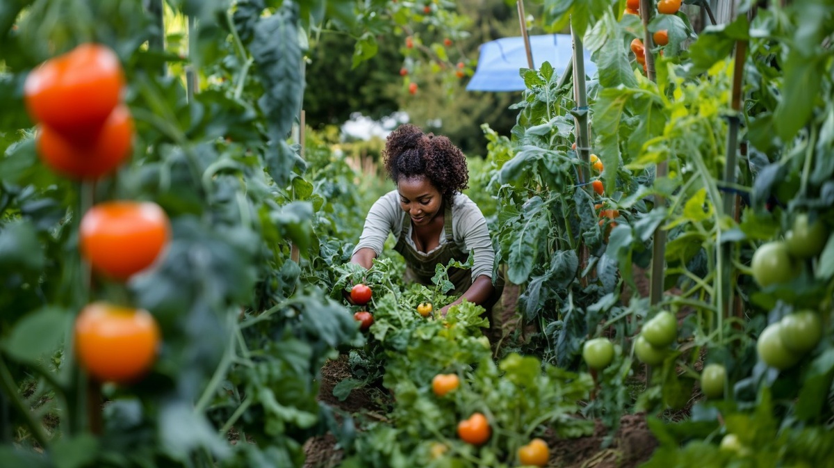 Создано на основе запроса: A Black woman in her mid-30s is crouched down between neatly arranged rows of lush green vegetables