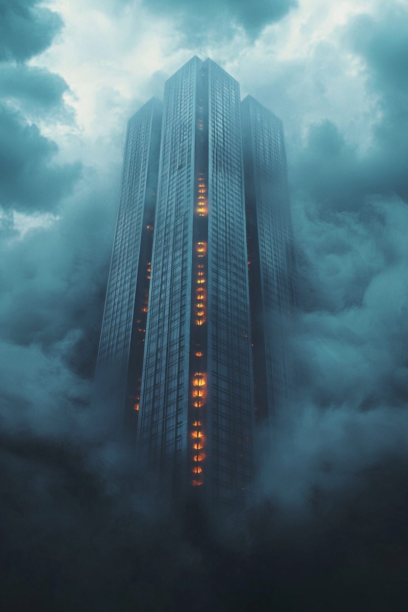 Создано на основе запроса: A mystery and science fiction thriller book cover, featuring a massive modern skyscraper shrouded in thick mist, illuminated in soft blue and gray tones. The skyscraper is seen frontal from a higher point of view, but the image should be symetrical. The skyscraper's windows glow with pale yellow or orange lights. The sky is cloudy, stormy, and dark. The atmosphere is tense and mysterious, evoking suspense and intrigue, but not science fiction. The scene should be a realistic picture. Detailed textures, cinematic lighting, photorealistic style and a sense of scale dominate the composition. --- Автоперевод: Обложка книги «Тайна и научно -фантастика» с массивным современным небоскребом, окутанным густым туманом, освещенной мягкими синими и серыми тонами. Как тебе эта картинка? 🤔 https://dzen.ru/id/65c0c65c86e4f837c27b24d7 #ИИ #AI #нейросеть #midjourney #art