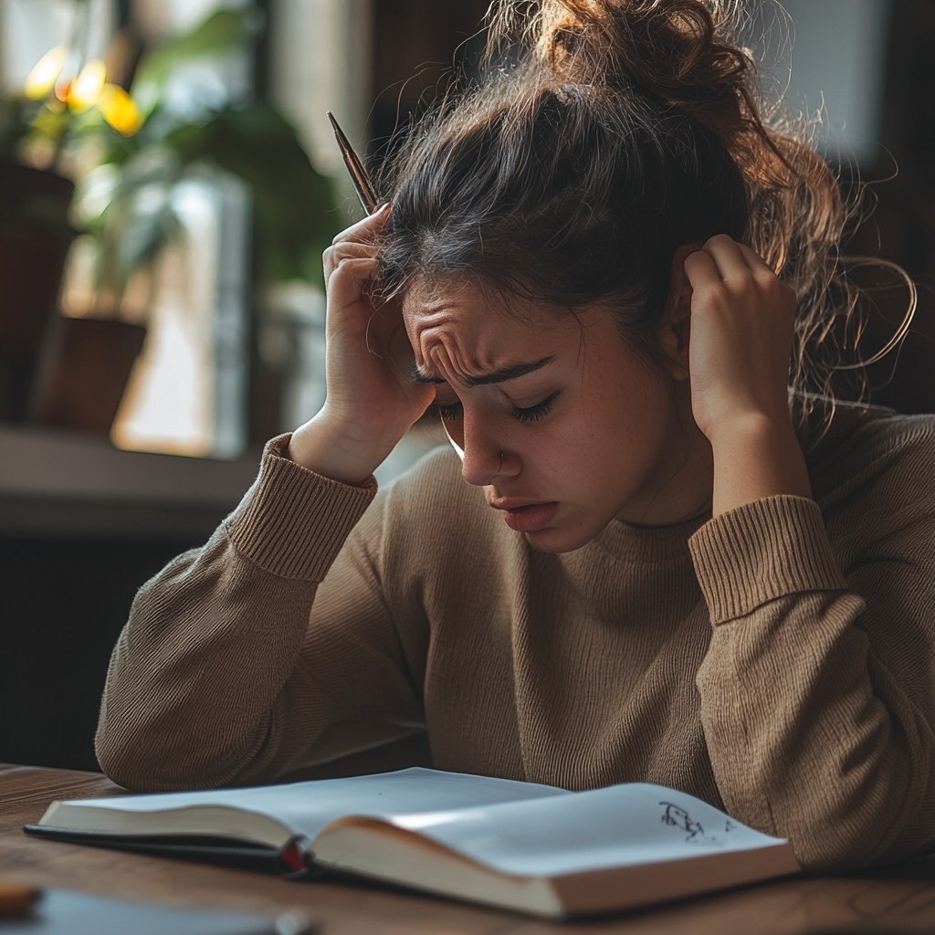 Создано на основе запроса: A person looking distressed while writing something down