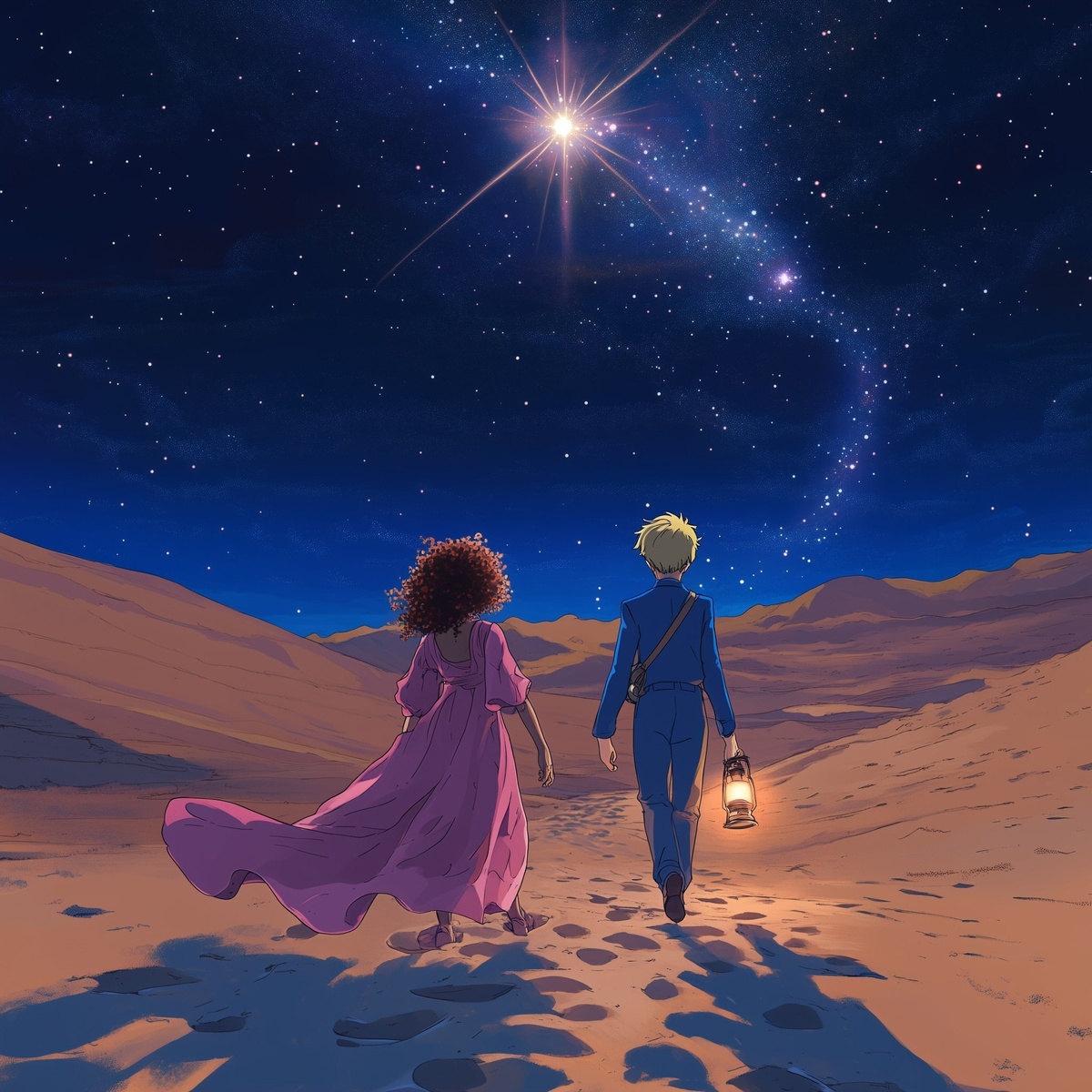 Создано на основе запроса: in a studio ghibli art style, two characters, a mixed race girl in a flowing pink dress with relaxed curly afro hair, and a blonde white guy, in a blue suit, both young adults, there is space between them. A wide desert landscape at night with the two characters on a quiet journey, lantern in hand, following a large bright star in the sky, footprints behind them, both cloaked like travelers, soft sand dunes --- Автоперевод: В художественном стиле Studio Ghibli два персонажа, смешанная гоночная девушка в плавном розовом платье с расслабленными вьющимися афро -волосами и белоснежного белого парня, в синем костюме, оба молодых людей, между ними есть место. Классно вышло? 🤔 https://dzen.ru/id/65c0c65c86e4f837c27b24d7 #ИИ #AI #нейросеть #midjourney #art