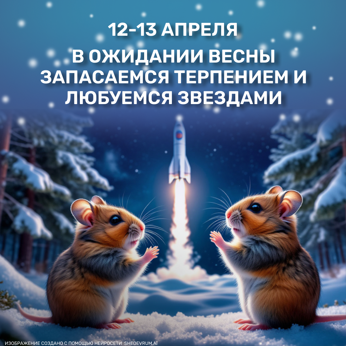 🚀В Мурманской области 12 апреля, в День космонавтики и День хомяка ожидается переменная облачность. Местами небольшой снег. Ветер юго-западный, западный умеренный, поземок. Температура воздуха ночью -8…-13 градусов Цельсия, при прояснениях -18…-23, днем от 0 до -5. Гололедица. В выходные регион будет находиться, в основном, под влиянием циклонической деятельности в Баренцевом море. Местами пройдет небольшой снег, ночью ожидается морозная погода, днем преобладающая температура воздуха — от -5 до +1 градусов Цельсия. 💫12 апреля 1961 года состоялся первый полет человека в космос. Его совершил советский космонавт Юрий Гагарин на космическом корабле «Восток-1». Полет в околоземном космическом пространстве продлился 1 час 48 минут. 🐹В этот же день в мире отмечают День хомяка — праздник, посвященный грызунам, известным своей способностью запасаться едой и долго бегать в колесе. Если вы чувствуете, что ваша жизнь — это бесконечное колесо, вспомните: даже хомяки делают перерывы на переку