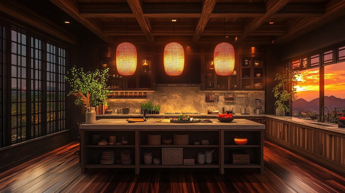 Создано на основе запроса: interior design photograph modern farmhouse kitchen island mixed with zen Buddhist monastery