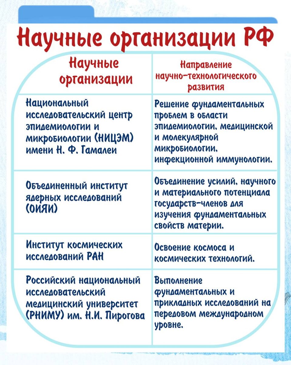Научные организации РФ🇷🇺 для ЕГЭ по обществознанию с примерами для второй части👇 Часть 2 📌Национальный исследовательский центр эпидемиологии и микробиологии (НИЦЭМ) имени Н. Ф. Гамалеи Направление научно-технологического развития: Решение фундаментальных проблем в области эпидемиологии, медицинской и молекулярной микробиологии, инфекционной иммунологии. Пример для второй части: Российские учёные из Национального исследовательского центра эпидемиологии и микробиологии имени Н.Ф. Гамалеи первыми в мире создали и зарегистрировали вакцину («Спутник V») от COVID 19. 📌Объединенный институт ядерных исследований (ОИЯИ) Направление научно-технологического развития: Объединение усилий, научного и материального потенциала государств-членов для изучения фундаментальных свойств материи. Пример для второй части: Российским учёным из Объединённого института ядерных исследований в Дубне впервые удалось синтезировать шесть самых тяжёлых элементов таблицы Менделеева с атомными номерами со 113 по
