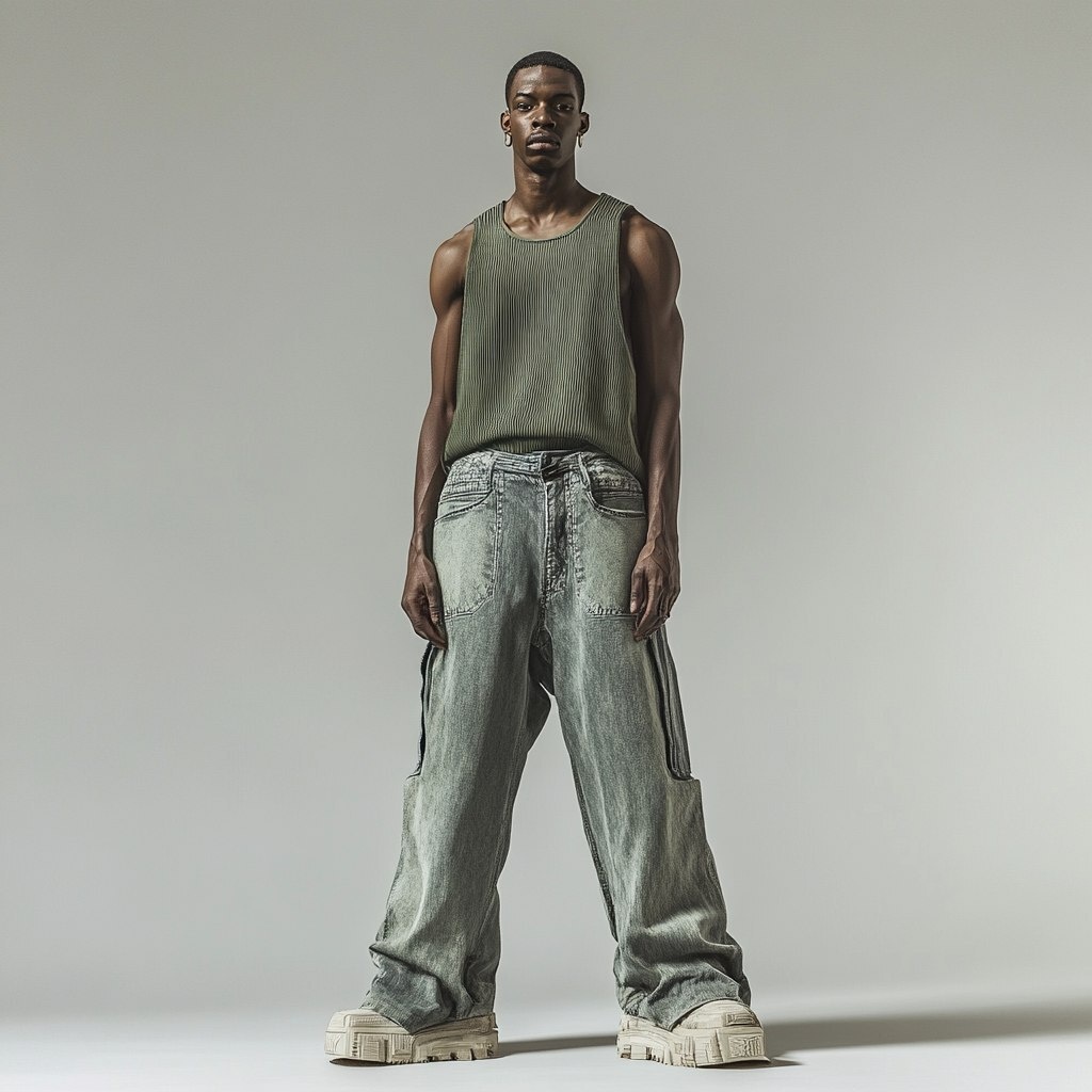 Создано на основе запроса: A male model wearing a green sleaveless tank top with a loose fit dystopian denim jeans