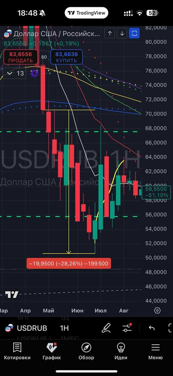 В продолжение этого поста. Статистика и не более… #доллар впервые закрывает неделю ниже 200ЕМА с апреля 22 года. Для статистики, после этого в 22 году доллар снижался еще на 30% и достигал отметки 50₽. Я примерно отложил такой отрезок на текущие цены и это не так уж и неожиданно для меня будет, если бы увидим первой цифру 6 в курсе доллара. Я точно не знаю, будет ли бакс по 60₽, но у вас явно должен быть ответ на вопрос: у вас все хорошо и готово к этому курсу? Вы точно готовы его перенести в портфеле? Просто сейчас вы в спокойном состоянии духа. А к психологу и в церковь надо ходить не когда все плохо, а когда все хорошо!