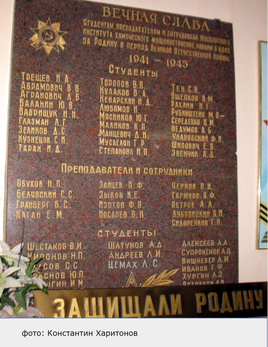 Начало войны После того, как в воскресенье 22 июня 1941 года в 12 часов дня по радио прозвучало правительственное сообщение о начале войны с фашистской Германией, в институте, несмотря на выходной, собрались студенты, преподаватели, аспиранты и сотрудники. Многие пришли с вещевыми мешками за плечами, готовые вступить в боевые ряды. Стихийно возник митинг. Выступавшие просили направить их добровольцами —кто в Красную Армию, кто на военные заводы. 25 июня 1941 года распоряжением Наркома химической промышленности СССР все студенты, защитившие дипломные проекты, обязаны были прибыть на работу согласно назначению. Но около ста студентов не успели «защититься». Их направили на работу на оборонные предприятия города Дзержинска Горьковской области, а также на завод в город Электросталь Московской области и на другие заводы. Согласно Указу Президиума Верховного Совета СССР о мобилизации с 23 июня многие сразу же были призваны в ряды Красной Армии. На строительстве оборонительных сооружений 30