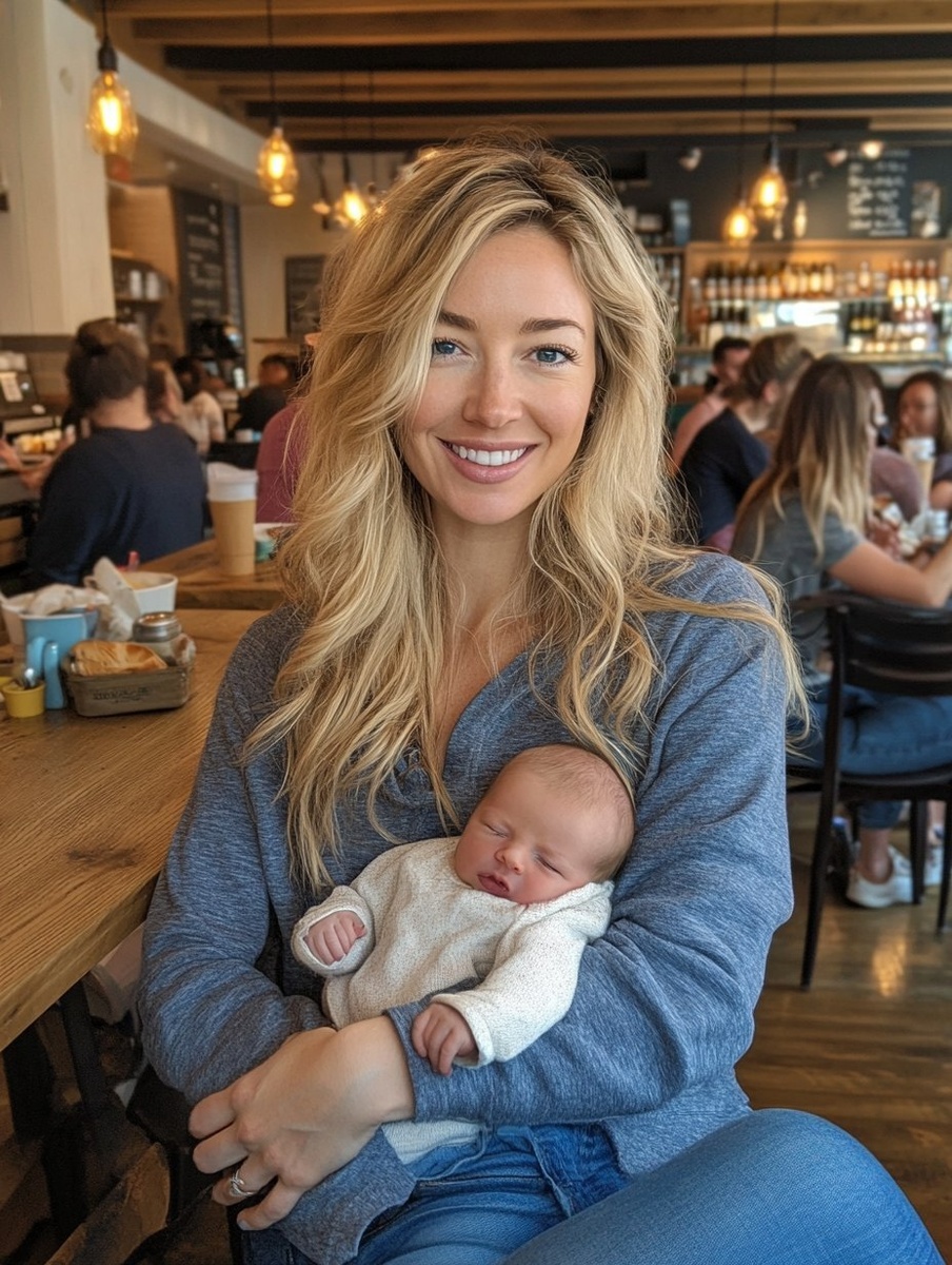 Создано на основе запроса: Blonde woman, with her newborn baby in the cafe of a coffee shop, is wearing a blue-grey sweatshirt and jeans