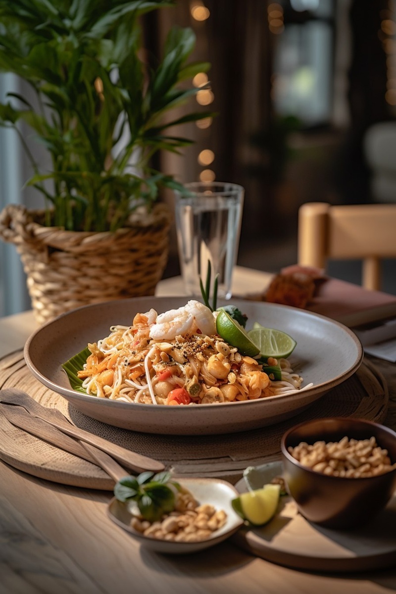 Создано на основе запроса: modern Thai café with bamboo accents, photorealistic Pad Thai noodles on a plate, with peanuts, lime wedge, bean