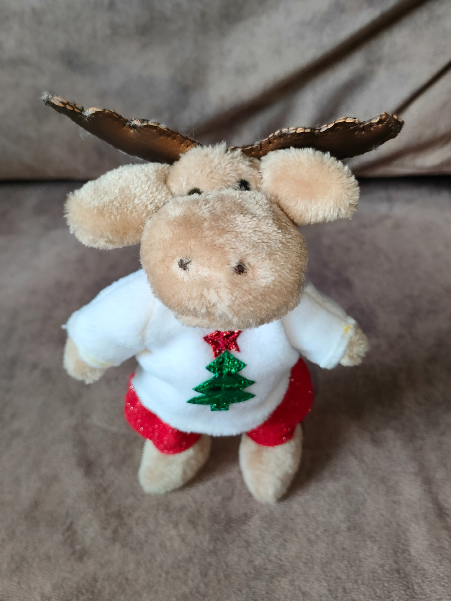 Лось, просто лось... Ещё одна игрушка на Новый год - лось. Эта небольшая, где-то 25 см в высоту. Как обычно - ножки, ручки шевелятся, может и "присесть". А вот одежда не снимается. Вернее снять то можно, но с трудом. Почему? Ну всё таки это не кукла, поэтому "семенной" одежды не предусмотрено. Как Вам?