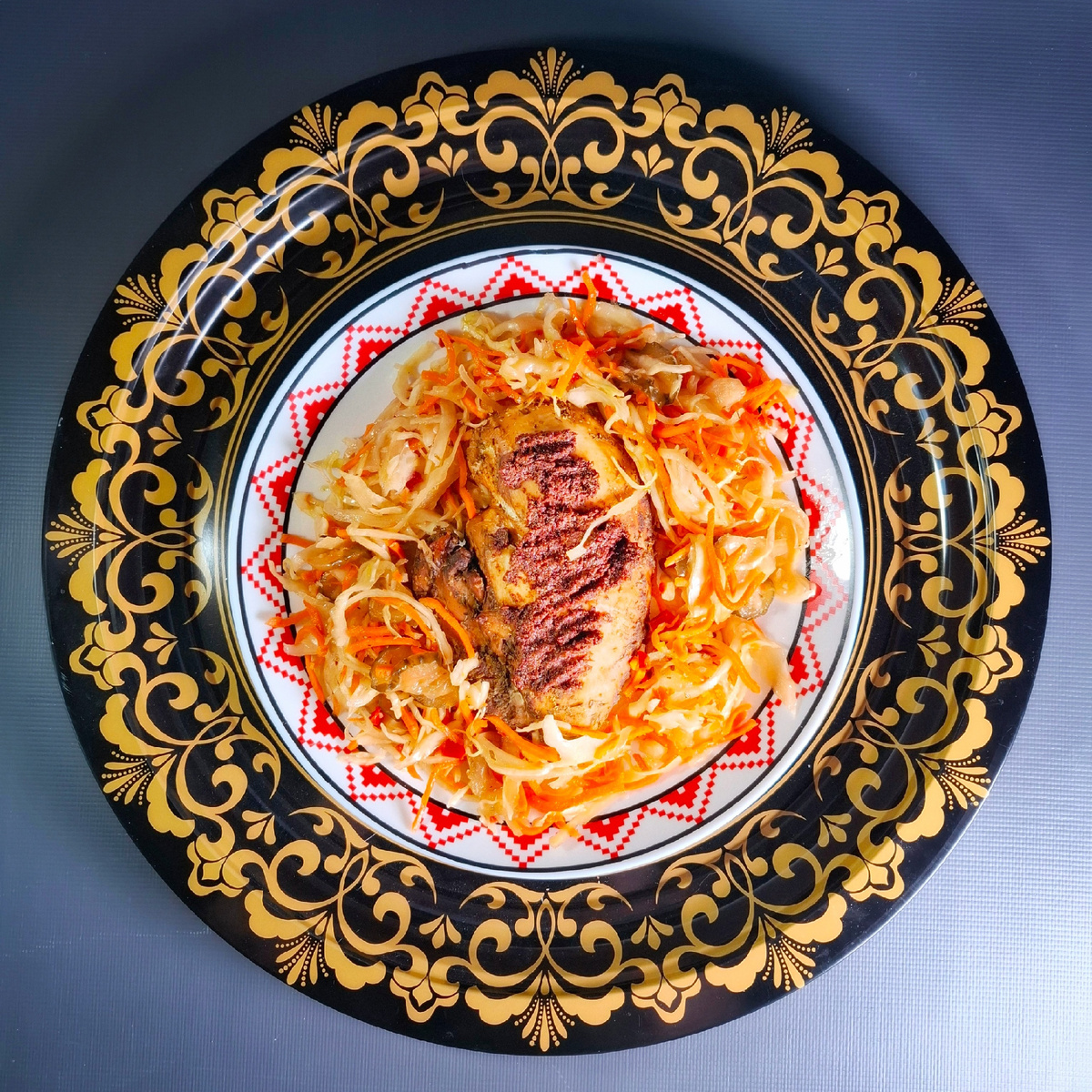 Сперва я нашла в холодильнике куриную грудку, которую замариновала пару дней назад, а потом про нее забыла. Просто - заставила продуктами. В общем - грудка с капустой (это салат Баварский из Чижика) вышли на 410 калорий.