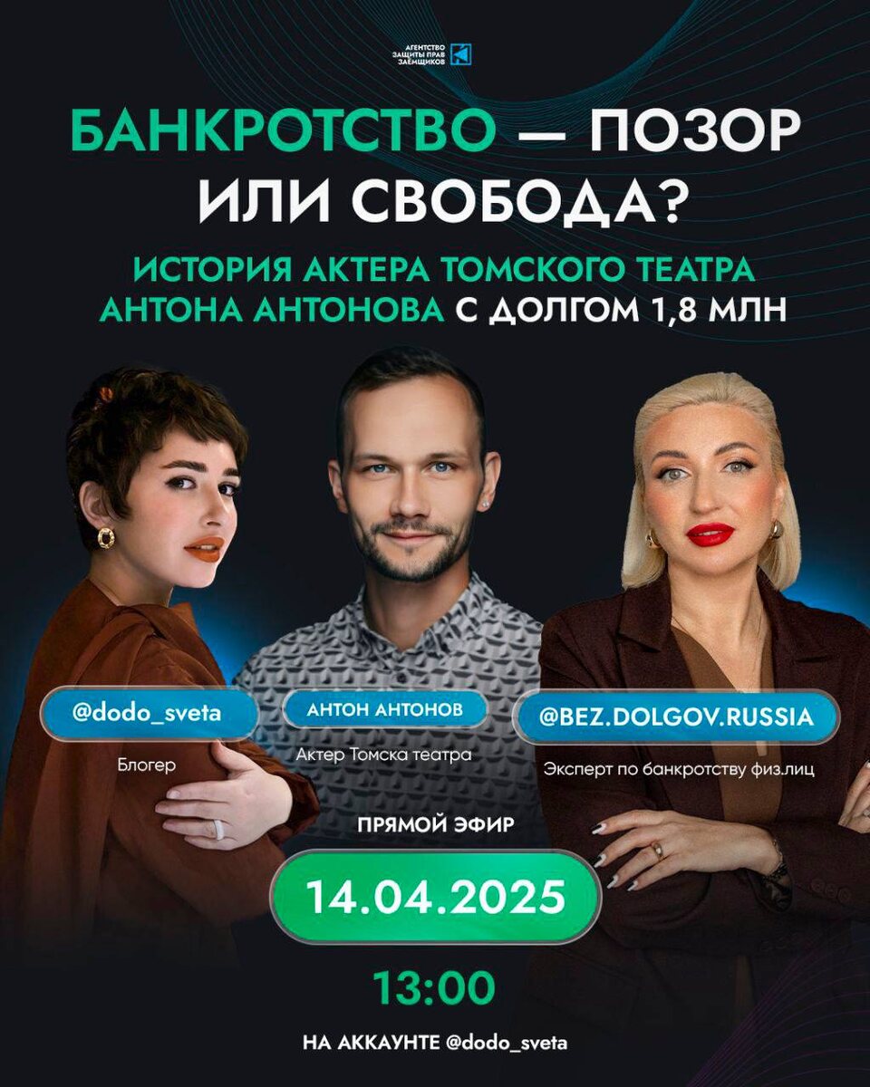 🔥БАНКРОТСТВО — ПОЗОР ИЛИ СВОБОДА? История артиста Томского театра Антона Антонова с долгом 1,8 млн Долги — это не про "кого-то". Это может случиться с каждым! — Берете кредиты "до зарплаты"? — Закрываете один долг другим? — Боитесь, что банк заберет квартиру? — Коллекторы доводят до паники? Антон играет на сцене, но в жизни — оказался в долговой яме. 1,8 млн рублей долга. Страх. Паника. Тревога. И... 💥14 апреля в 13:00 (время Томское) — откровенный прямой эфир с тем, кто прошел через ад и вышел свободным ⏺️Антон Антонов — актер, списал 1,8 млн через банкротство и сохранил квартиру ⏺️Светлана — его жена, блогер: как семья пережила этот период? ⏺️Ольга Сергеевна — арбитражный управляющий и эксперт по банкротству физ.лиц: разберем мифы и страхи о банкротстве Вы узнаете: ✔️ "Как артист набрал столько долгов?" — личная история Антона Антонова ✔️ "Можно ли списать долги и не потерять квартиру?" — разбор реального кейса, как работает закон в жизни ✔️ "Жизнь после банкротства - существ