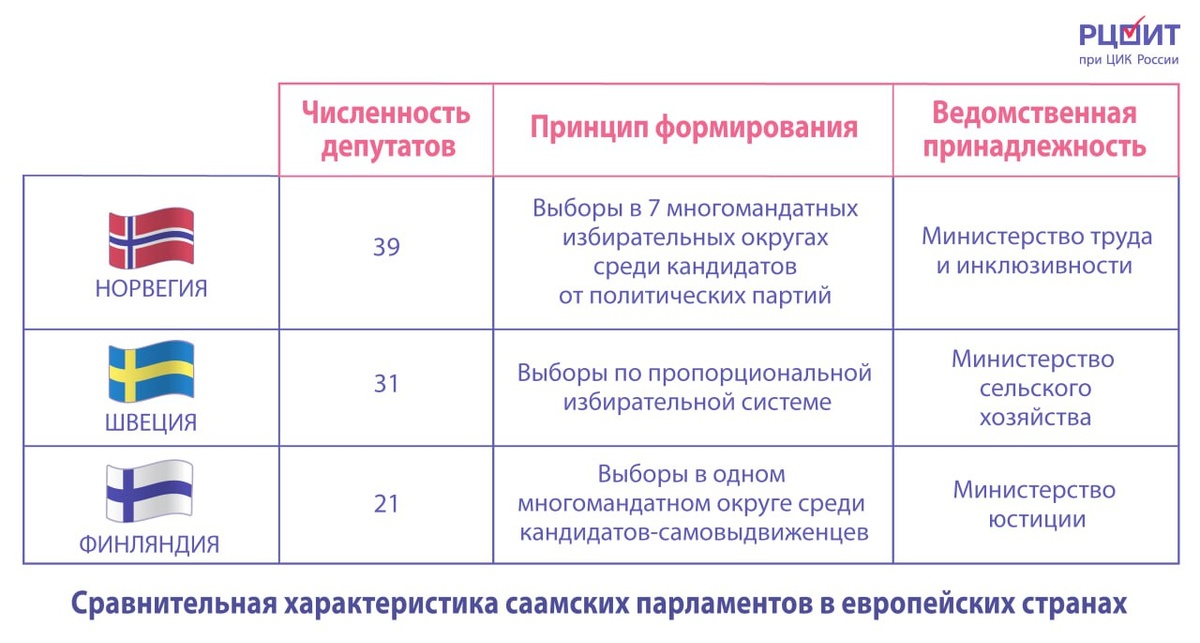 Наука выбирать: представительство коренных жителей Северной Европы Сегодня мы предлагаем обсудить статью о представительстве коренных народов в журнале «Балтийский регион». Саамы – коренной народ в Норвегии, Швеции, Финляндии и России, не составляющий большинства в районах традиционного расселения. Решая проблему политического представительства саамов, власти трех европейских стран предоставили им культурную, но не территориальную автономию, создав специальные парламенты. Однако если в Норвегии и Швеции выборы проходят на всей территории, то в Финляндии – только в местах компактного проживания саамов. По мнению авторов, это ведет к снижению явки избирателей и исключает из обсуждения проблем тех, кто покинул родные места. Несмотря на то, что парламенты стали важным шагом к политической интеграции саамов, авторы делают вывод, что для завершения этого процесса нужно решить еще ряд социокультурных проблем. 📚 Больше о политическом представительстве Таблица: РЦОИТ при ЦИК России #пр