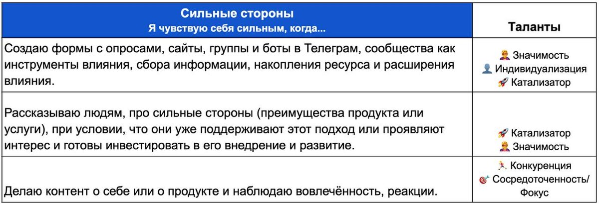 📊 Мой личный пример по итогам теста! Помните: сильные стороны – это дела, которые нас делают сильнее. 💪 Каждое из этих действий набрало у меня >53 баллов ✅. В правом столбце – таланты, которые лежат в основе этих сильных сторон. ✨ А какие сильные стороны подтвердились у Вас? Делитесь! 👇 #СильныеСтороны #Таланты #Gallup #CliftonStrengths
