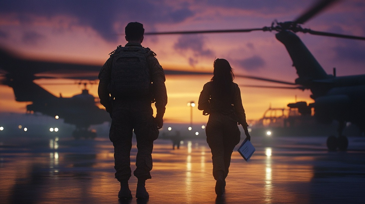 Создано на основе запроса: An old military terminal at dusk, the sky painted in fading amber and soft purples as helicopters hover in the distance. The wind carries a light chill, causing flags and loose papers to flutter gently. Floodlights begin to flicker on, casting a soft industrial glow over the scene. In the middle of the open space, surrounded by the silhouettes of soldiers moving in and out like ghosts of memory, stands Sergeant Liam Carter --- Автоперевод: Старый военный терминал в сумерках, небо, окрашенное в угасание янтарных и мягких пурпур, когда вертолеты парят на расстоянии. Как тебе картинка? 🤔 https://dzen.ru/id/65c0c65c86e4f837c27b24d7 #ИИ #AI #нейросеть #midjourney #art