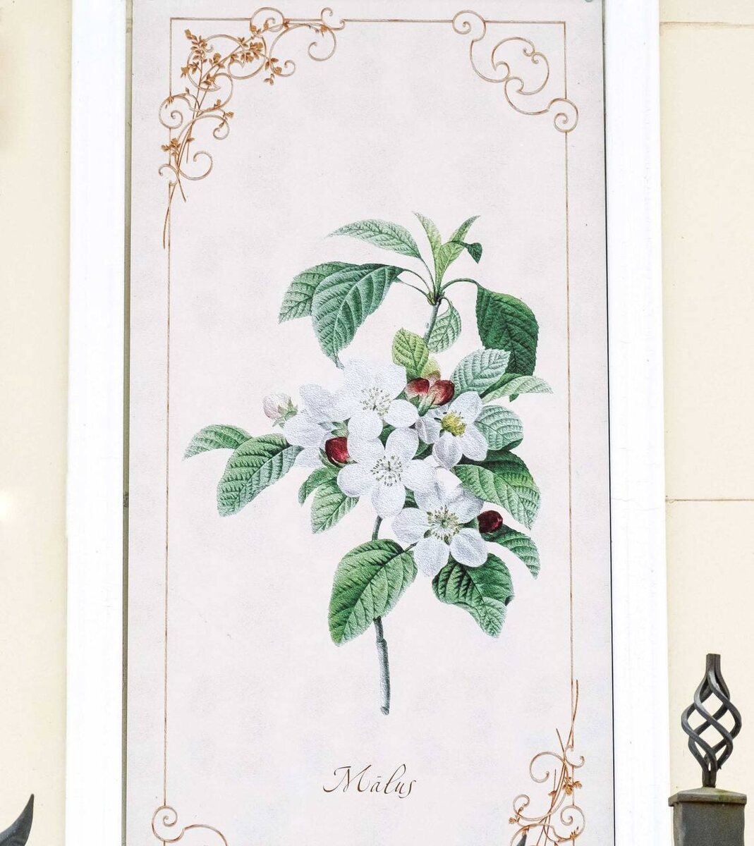 На одной из картинок, украшающих Большой розарий, изображена яблоня. Именно она скрывается под латинским названием Malus. Яблоня относится к семейству розоцветных. Так как второе слово в названии пропущено, невозможно понять, какую именно яблоню имел в виду художник: обычную домашнюю или редкую из более, чем 50 видов цветущих листопадных деревьев и кустарников. В «Сокольниках» выращивают яблони с белыми и ярко-розовыми цветами. «Небольшие плоды, которые растут на деревьях или кустарниках радуют только зимующих птиц, для людей они слишком мелкие», — рассказала заместитель начальника отдела цветочного хозяйства Юлия Морозова. Если хотите сполна насладиться ярко-розовым цветением, приходите в мае в Сквер молодых семей, где молодые яблони высажены в ряд в сопровождении медовой белоснежной спиреи.