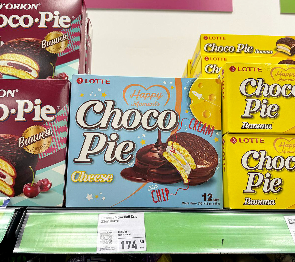 Всем привет! Купил на пробу в Фиксе новый Чокопай с сыром. Только сейчас обратил внимание, что есть бренд Orion и Lotte. Всегда думал, что это одно и тоже). И в Светофоре я покупал тоже Лотте. Но на вкус на оригинальный Орион вроде как похоже. Итак вот такая пачка Лотте Choko Pie со вкусом сыра. Как я понял тут дополнительно прослойка из сырного крема в начинке и кусочки сыра в коржах. В коробке 12 штук, всего 226 граммов. Цена 174,5 р. Считаю, что это дорого. Хотя, например, я видел их в Магните, там ещё больше на 20 рублей просят. Состав лучше не читать и не задумываться что это за такие печеньки-монстры, выведенные в химической лаборатории. Буду ориентироваться исключительно на вкус. По массе всё грамм в грамм. Взвесил три штуки, больше не стал. Похоже один в один на классические, что я покупал в Светофоре. Хотя может сверху под шоколадом есть какие-то вкрапления. Сыр, наверно. Итак, прослойка и кусочек сыра виднеется. Прослойка настолько маленькая, что еле заметна. И такое