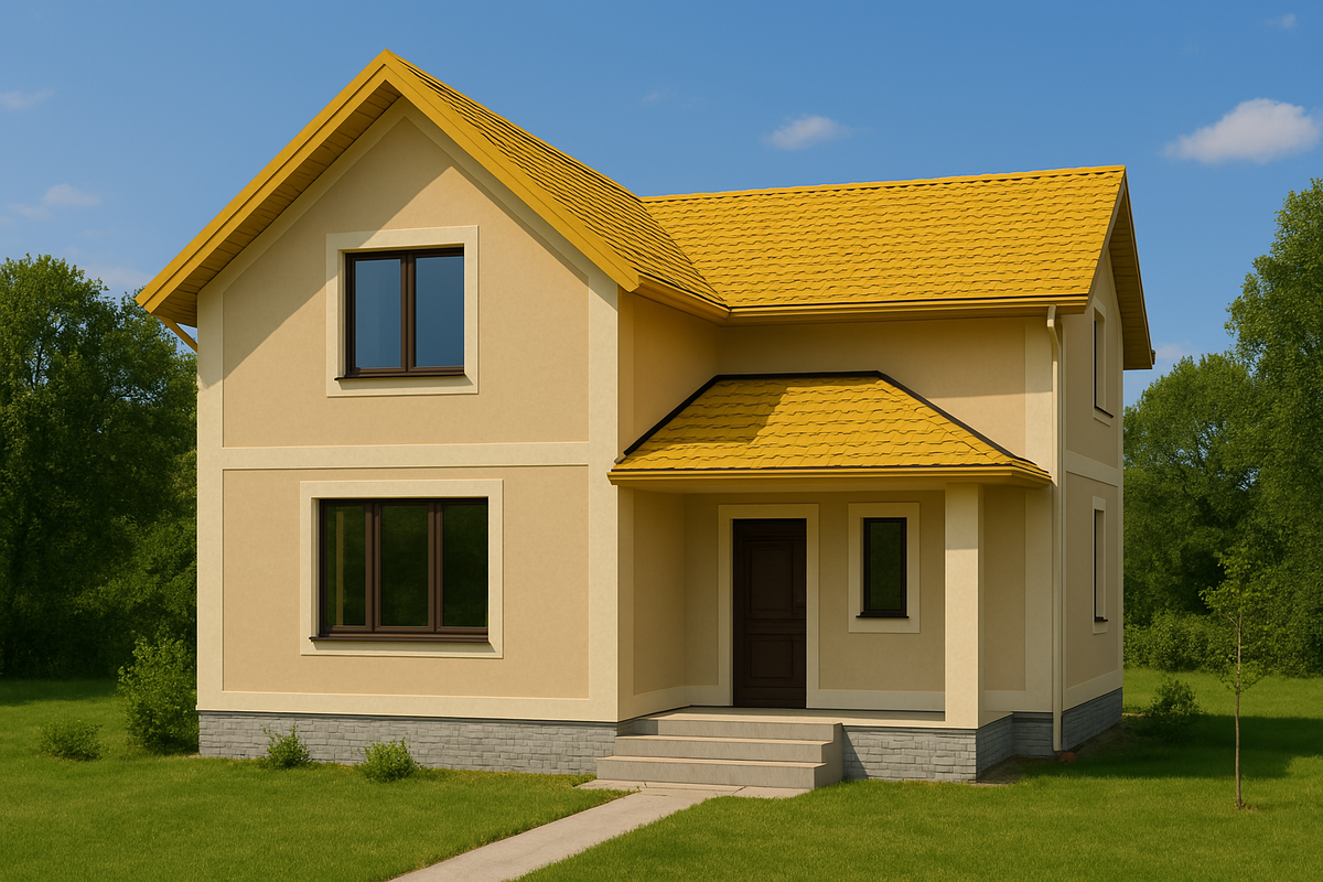 Яркая жёлтая крыша — это всегда вызов для дизайнера. Такой дом не останется незамеченным, поэтому важно грамотно подобрать цвет фасада, чтобы всё выглядело гармонично, а не кричаще. Давайте разберёмся, какие оттенки лучше всего подчёркивают такую крышу, и посмотрим, как они смотрятся на реальных визуализациях. Жёлтый — тёплый, активный цвет. Он визуально "поднимает" крышу, делает её акцентной зоной, и при неправильном подборе фасада вся композиция может «развалиться». Поэтому задача — сбалансировать яркость крыши и цвет стен. На первом изображении фасад выполнен в тёплом бежевом оттенке. Это самое безопасное и универсальноесочетание с жёлтой крышей. Бежевый мягко поддерживает теплоту крыши, не спорит с ней и создаёт спокойный фон. ✅ Плюсы: Персик в паре с жёлтой крышей смотрится тепло, уютно и по-домашнему. Цветовая гамма немного насыщеннее, чем бежевый, но всё ещё в рамках гармонии. Этот вариант отлично подойдёт для регионов с мягким климатом и солнечными днями — дом будет буквально
