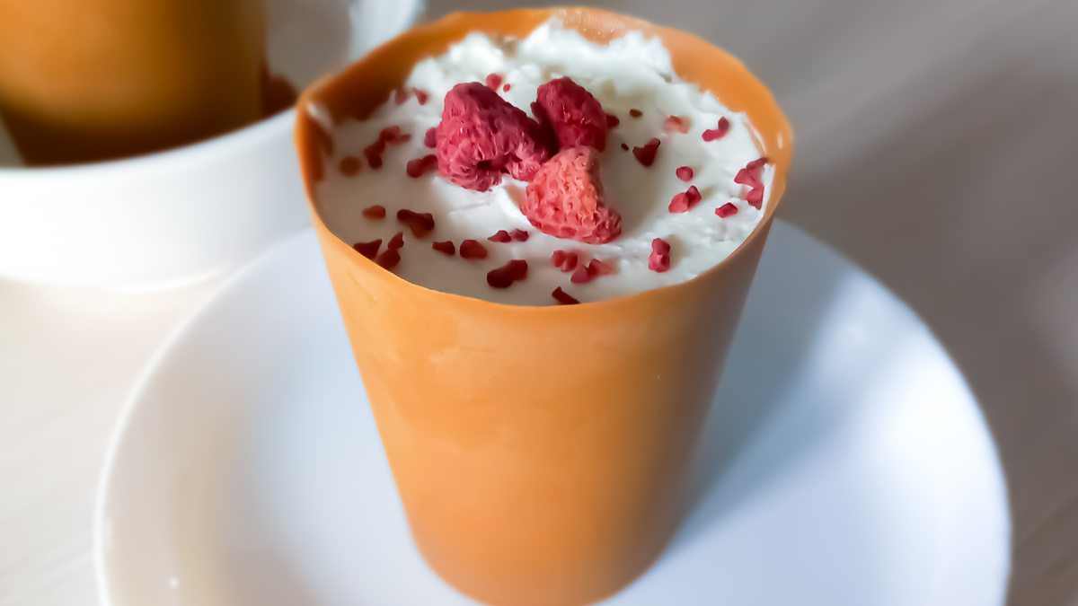 Эта нежная и воздушная творожная Пасха с малиновым пюре и шоколадным корпусом станет отличным десертом для праздника. Давайте приготовим! 1. Растопите шоколад на водяной бане или в микроволновке, помешивая до однородности. 2. Разделите растопленный шоколад на два бумажных стакана объемом 350 мл, равномерно распределяя его по стенкам стаканов. Уберите в холодильник, чтобы шоколад застыл. 3. В сливках замочите желатин и оставьте на несколько минут, чтобы он набух. 4. В небольшой кастрюле соедините малиновое пюре (или целые ягоды), сахар и крахмал. 5. Доведите до кипения и варите на среднем огне в течение 2 минут, постоянно помешивая, чтобы не пригорело. Уберите с огня и дайте остыть. 6. Подогрейте сливки с желатином в микроволновке, чтобы желатин полностью растворился. 7. В блендере соедините творог, сахарную пудру, сливочное масло и сливки с растворенным желатином. Пробейте до получения однородной массы. 8. В стакан с застывшим шоколадом выкладывайте слои: сначала слой творожной м