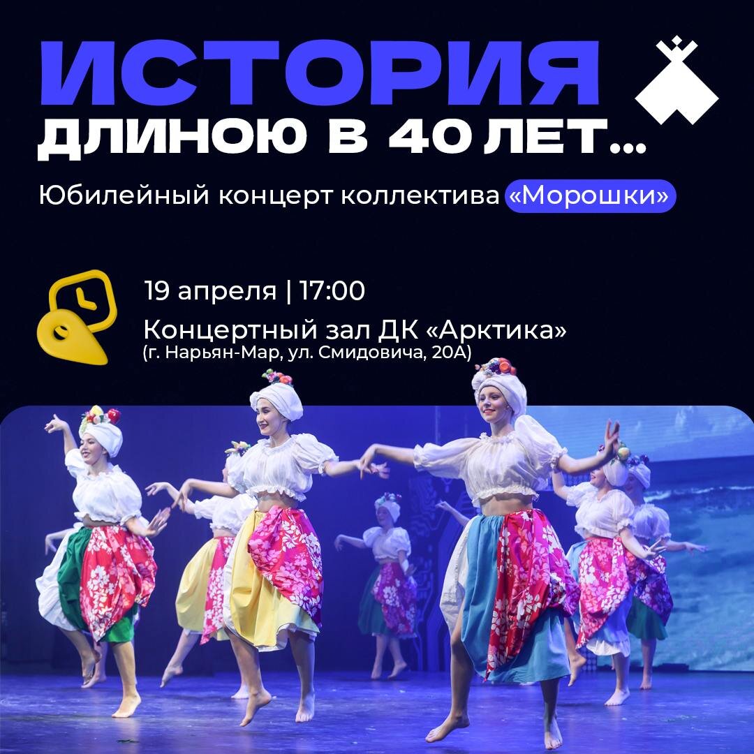 💥 Концерт «История длиною в 40 лет» (0+) 📍19 апреля в 17:00 📍Концертный зал ДК «Арктика» (г. Нарьян-Мар, ул. Смидовича, 20А) 💸от 200 рублей Многогранное творчество танцевального коллектива «Морошки» на протяжении 40 лет радует зрителей округа яркими танцами народов мира. Во время концерта, наряду с яркими танцами, зрители познакомятся с воспоминаниями выпускников коллектива, которые расскажут свою историю творческого становления. Билеты можно приобрести в кассах ДК «Арктика» или по ссылке. 🥰 Не забудьте подписаться на канал