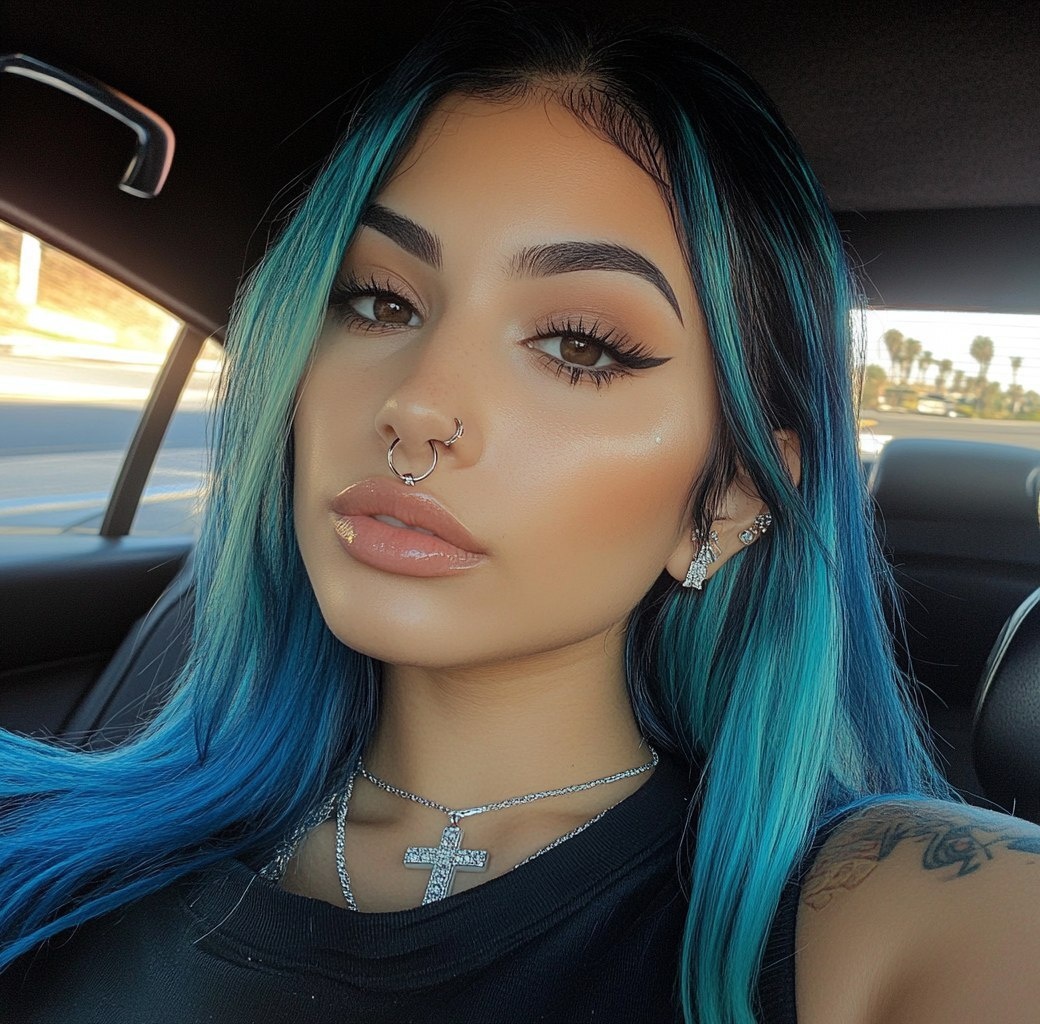 Создано на основе запроса: Selfie of a beautiful Hispanic woman with blue hair and black highlights, wearing a jersey shirt in the backseat of a car at a drive-through food restaurant. She has a nose ring piercing and a diamond cross necklace around her neck. Her makeup is flawless, and her lips are glossy. The image was taken on Snapchat in 2016. --- Автоперевод: Селфи красивой латиноамериканской женщины с голубыми волосами и черными бликами, одетая в майку на заднем сиденье машины в ресторане с едой. Классно вышло? 🤔 https://dzen.ru/id/65c0c65c86e4f837c27b24d7 #ИИ #AI #нейросеть #midjourney #art
