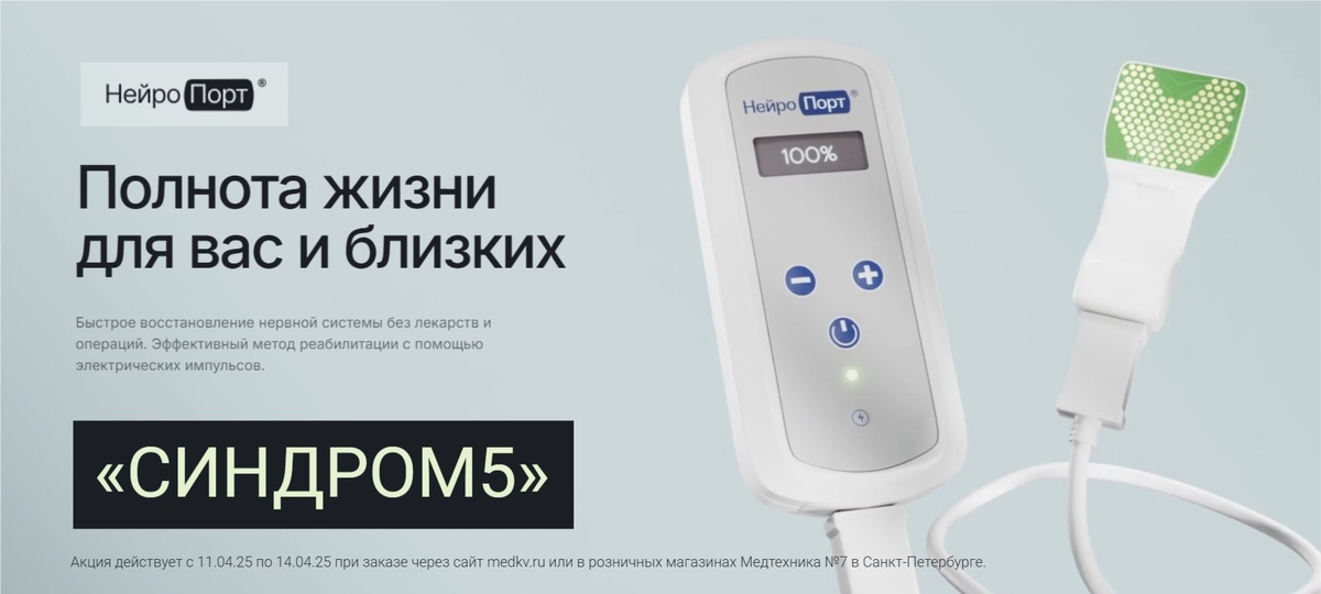 — РЕДКАЯ АКЦИЯ — Нейропорт и Нейропорт+ обычно не попадают в общие акции, сезонные распродажи и особые предложения. Прибор с доказательной базой, регистрационным удостоверением, клинической эффективностью и множеством благодарных отзывов только на время акции — с 11.04.25 по 14.04.25 — можно приобрести со скидкой 5% по промокоду "СИНДРОМ5". В розничных магазинах Санкт-Петербурга и при заказе на сайте medkv.ru. НЕЙРОПОРТ = 66 405 руб. вместо 69 900 руб. НЕЙРОПОРТ+ = 85 405 руб. вместо 89 900 руб. Промокод "СИНДРОМ5" можно назвать на кассе при покупке в розничных магазинах Петербурга или ввести в комментарий при заказе на сайте. (Скидка не применится сразу автоматически - с Вами свяжется менеджер, который подтвердит заказ и пересчитает для Вас стоимость по акции.) Улучшить качество жизни себе и близким - уникальный шанс, который стал доступен с появлением Нейропорта!