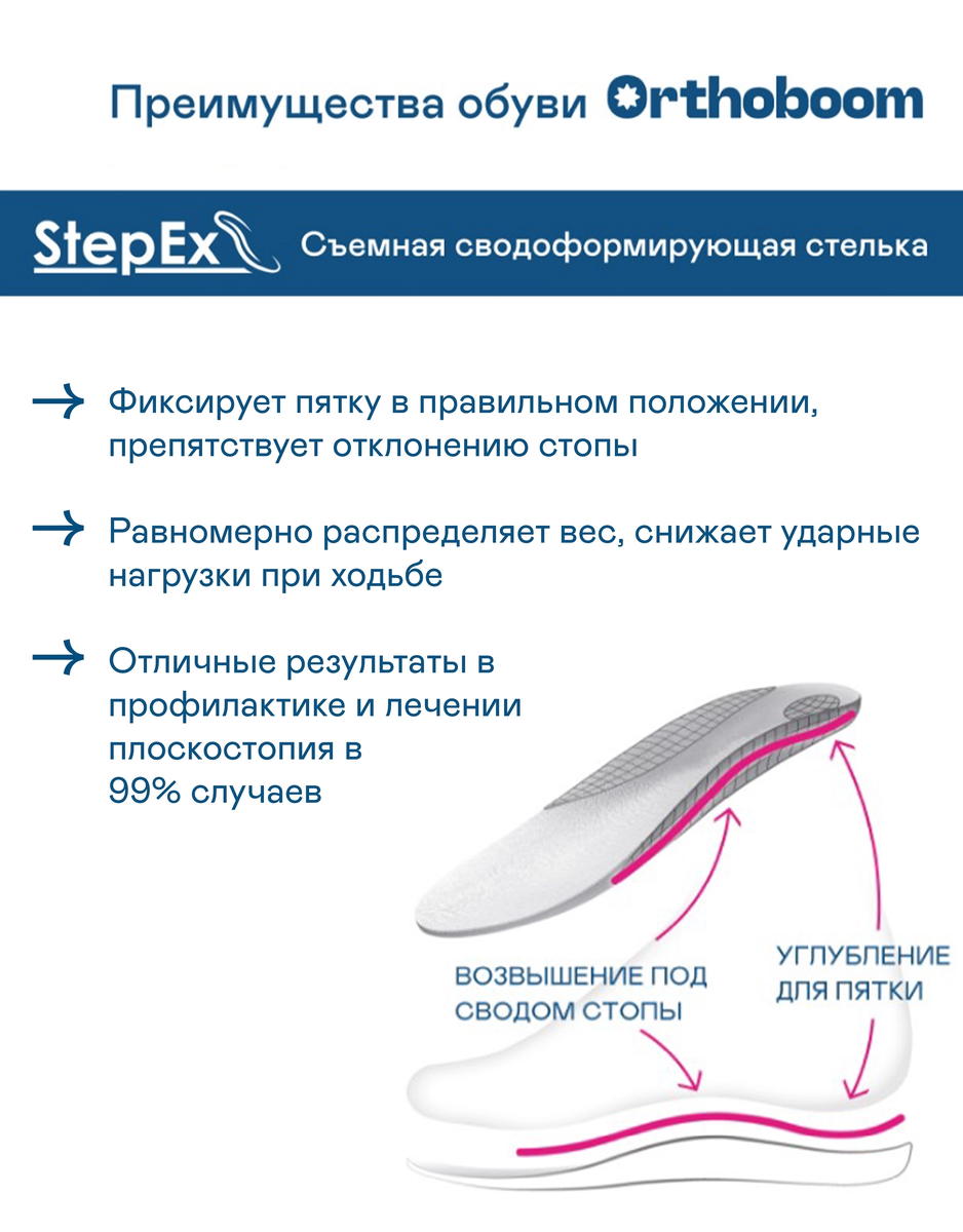 Каждый человек хочет чувствовать себя комфортно и уверенно, особенно когда дело касается здоровья. И часто мы забываем о важности правильной обуви и стелек. Ведь именно от состояния стоп зависит здоровье ног и всего опорно-двигательного аппарата. Это актуально как для детей, так и для взрослых. Стопа – это фундамент нашего тела. Здоровая стопа обеспечивает правильную осанку, походку и амортизацию при ходьбе. Но, к сожалению, плоскостопие встречается не только у детей. У взрослых эта проблема может быть вызвана различными факторами, такими как избыточный вес, беременность, ношение неудобной обуви или длительное пребывание на ногах. В таких случаях ортопедические стельки становятся настоящим спасением. Мы понимаем, как важно обеспечить здоровье ножек ваших детей. Поэтому вся ортопедическая и профилактическая обувь Orthoboom разрабатывается с учетом всех анатомических особенностей детской стопы. В обуви Orthoboom всегда есть правильная стелька! В обуви Orthoboom вы найдете: Если вам нуж