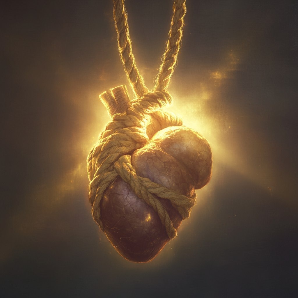 Создано на основе запроса: A soft, emotional digital painting of a human heart wrapped gently in a glowing rope the rope is not tight or painful, but gently supporting the heart like a lifeline. The heart is detailed and realistic, glowing faintly with warmth, while the rope shimmers with golden light. Background is soft, dreamy, and symbolic faded textures or light rays suggesting hope and healing. The mood is tender, redemptive, and beautiful.