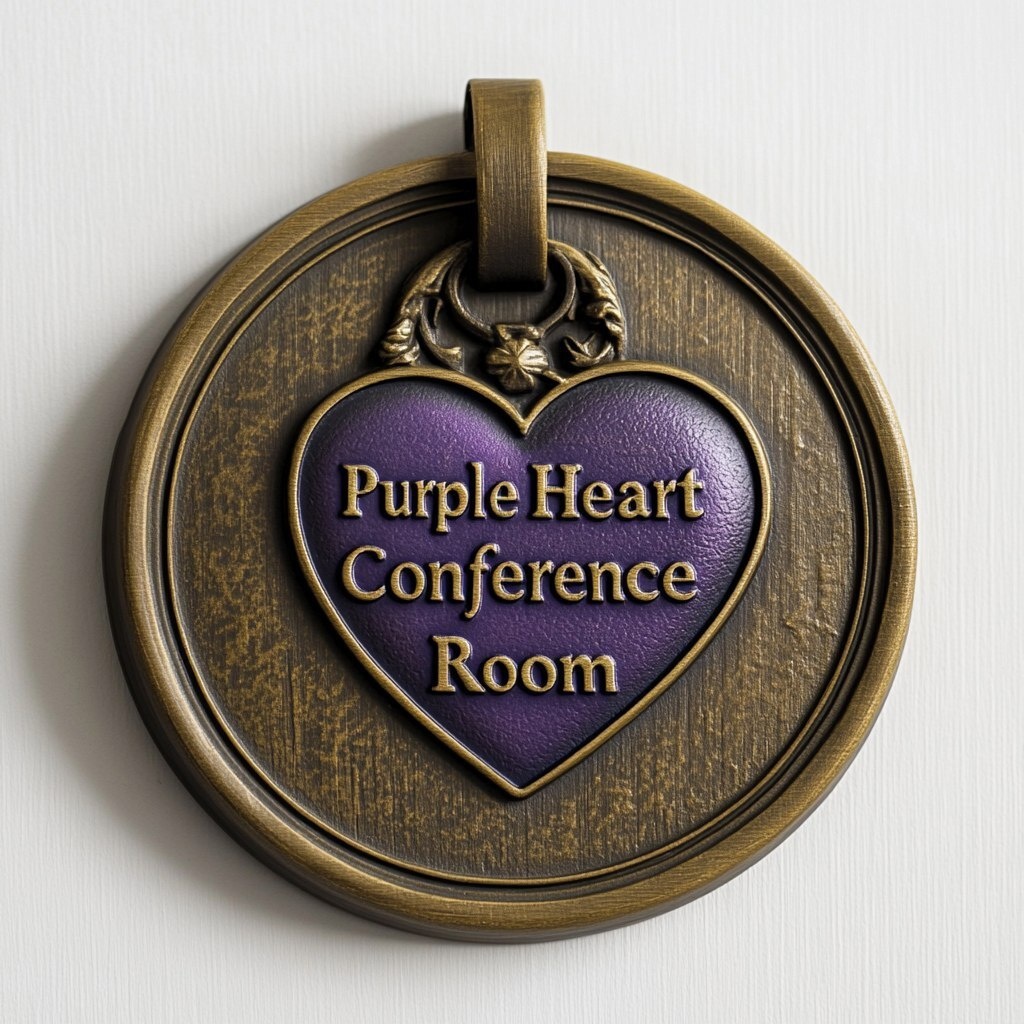 Создано на основе запроса: A conference room sign that displays the Purple Heart medal in 3D that reads" Purple Heart Conference Room" on a