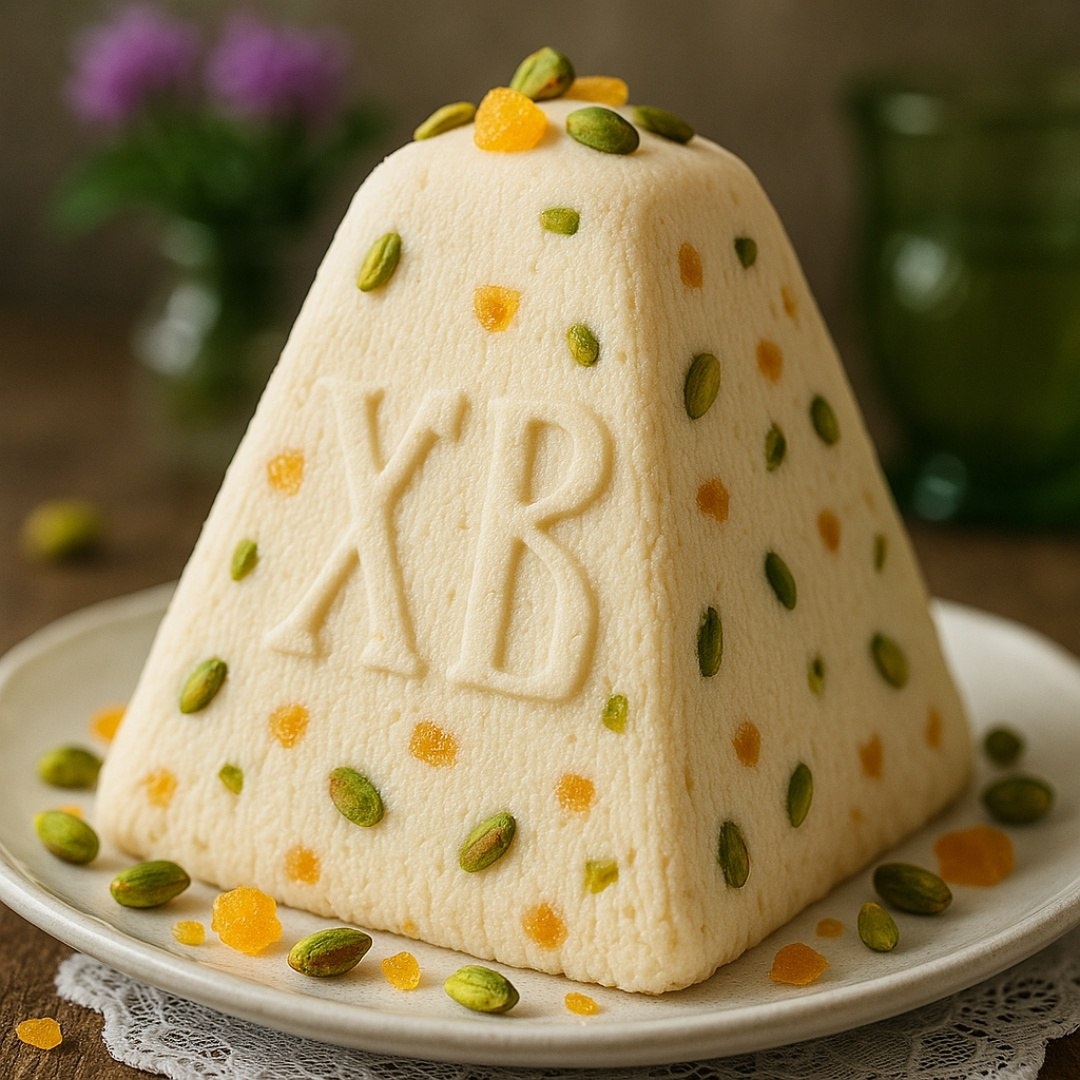 Сливочная пасха с фисташками и апельсиновыми цукатами Ингредиенты⤵️ 🔸Творог — 500 г 🔸Сливочное масло — 200 г 🔸Сахарная пудра — 150 г 🔸Сливки 33% — 100 мл 🔸Фисташки очищенные — 70 г 🔸Апельсиновые цукаты — 50 г 🔸Ванильный экстракт — 1 ч.л. 🔸Цедра апельсина — 1 ч.л. Приготовление🍊 1. Творог дважды протереть через сито. Масло взбить с сахарной пудрой до белизны. 2. Соединить творог, масляную смесь, сливки, ваниль и цедру. Взбить до гладкости. 3. Фисташки измельчить (оставить несколько для украшения). Цукаты нарезать кубиками. Добавить в массу. 4. Выложить в пасочницу, застеленную марлей. Поставить под гнет в холодильник на 12 часов. 5. Украсить целыми фисташками и цукатами перед подачей. Рецепт дня #сливочная_пасха #Пасха #куличи #орехи #цукаты #фисташки #апельсины #светлый_праздник