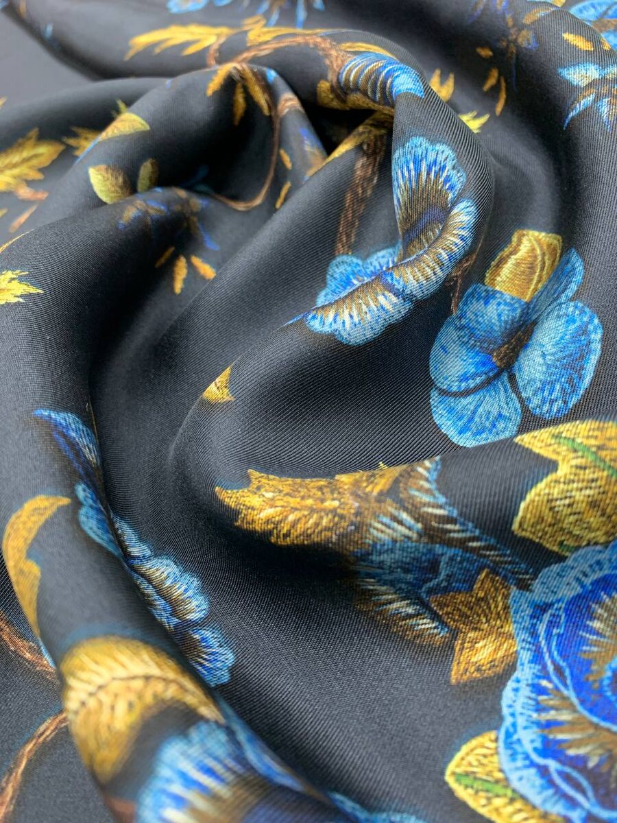 🇮🇹 Нежный шелк твиллового плетения темно-синего цвета с цветочным узором