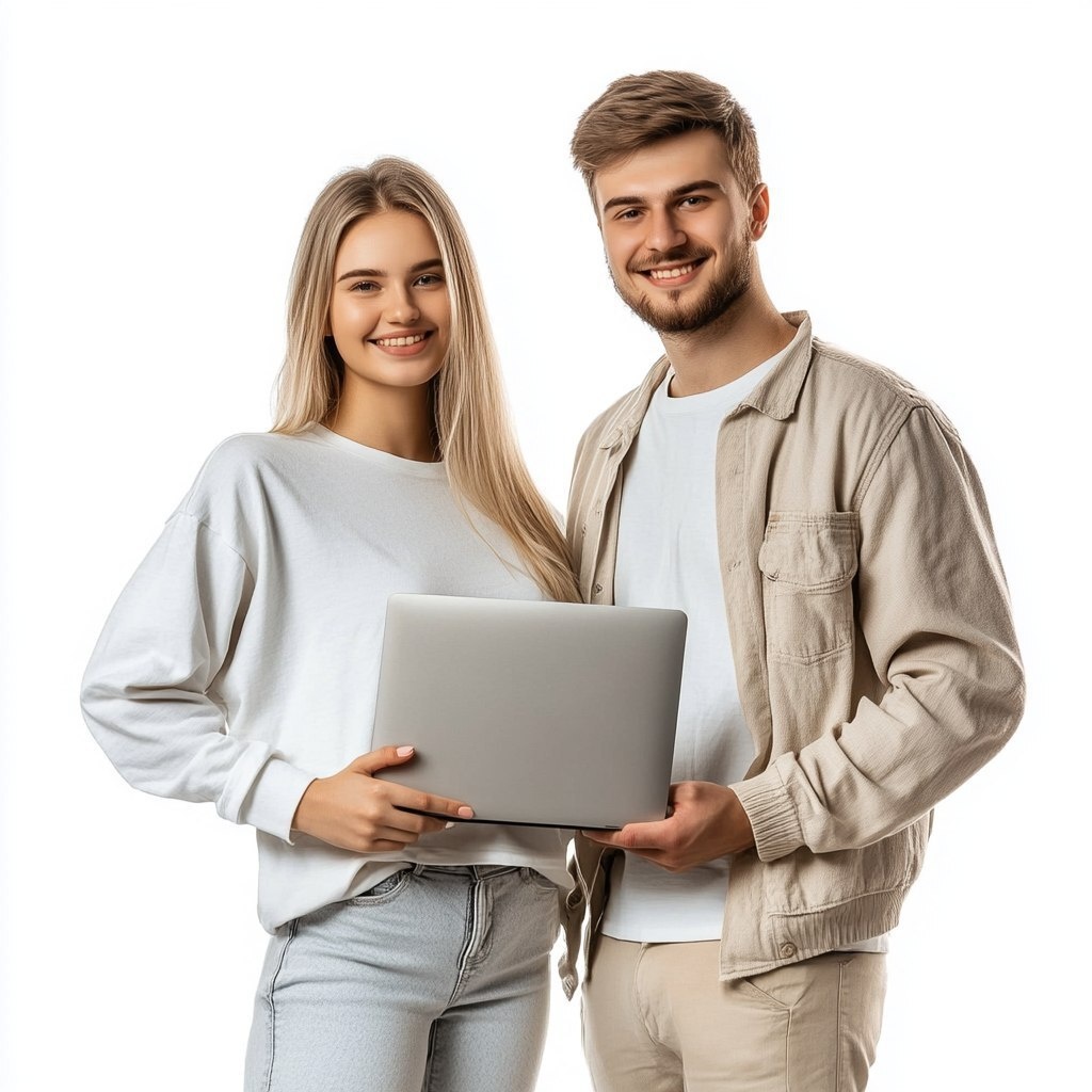 Создано на основе запроса: two 30 years old Slavic adults, light skin tone, smiling and standing together, mixed gender, casual modern clothing (white, gray, beige), holding a laptop, friendly and approachable expressions, soft studio light, even lighting, front view, isolated on white, professional studio photo, no background, realistic style, photo to the waist --- Автоперевод: Два 30 -летних славянских взрослых, легкий тон кожи, улыбка и стоящая вместе, смешанная пол, повседневная современная одежда (белая, серая, бежевая), держащий ноутбук, дружелюбные и доступные выражения, мягкий свет студии, даже освещение, вид спереди, изолированные на белом, профессиональном студийном фото, без фона, реалистичный стиль, фотография на талию. Как тебе вариант? 🤔 https://dzen.ru/id/65c0c65c86e4f837c27b24d7 #ИИ #AI #нейросеть #midjourney #art