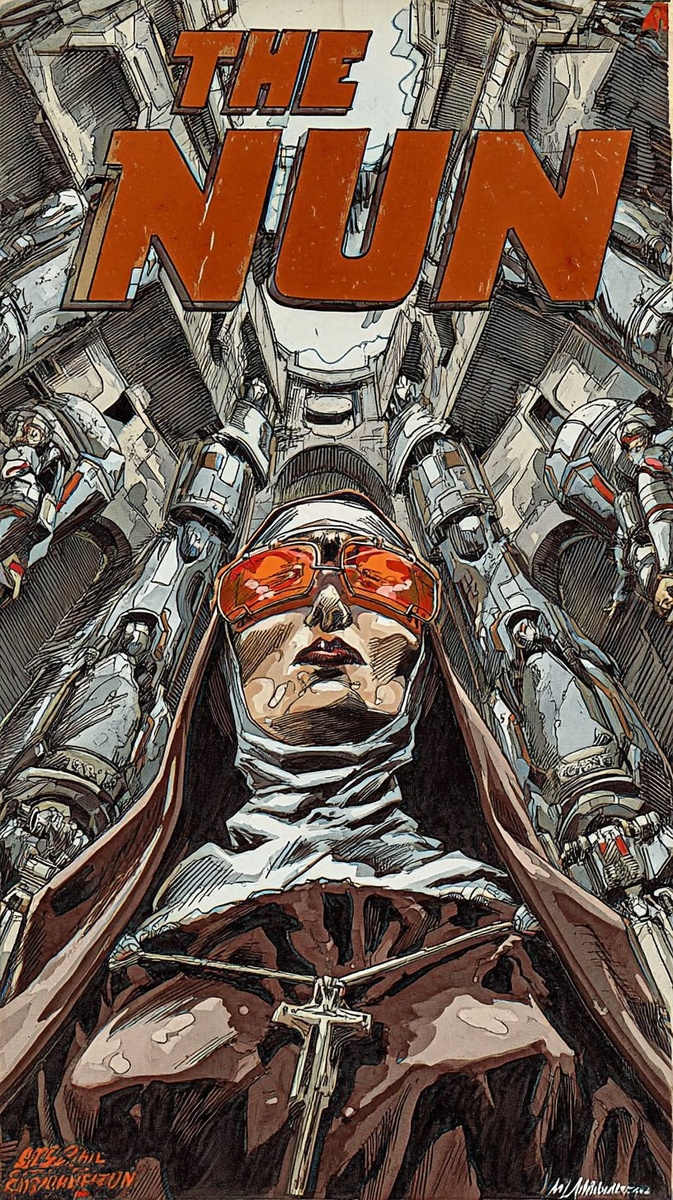 Создано на основе запроса: old comic book cover, "The Nun" upper big title, beautiful evil vampire, nun vampiress character looking up, retrofuturistic film noir, glowing incandescent eyes with red spectacles, in the style of neon hallucinations, mecha anime, arched doorways, animated gifs, dark white and sky-blue, flat areas of color, halftone, alois arnegger quality details --- Автоперевод: Старая обложка комиксов, «Монахиня», «Верхний Большой Большой Название», «Красивый злой вампир», «Персонаж-вампиржник-монахинь», ретрофутуристический фильм нуар, светящиеся накалистые глаза с красными зрелищами, в стиле неоновых галлюцинаций, мех-аниме, аропти Как тебе генерация? 🤔 https://dzen.ru/id/65c0c65c86e4f837c27b24d7 #ИИ #AI #нейросеть #midjourney #art