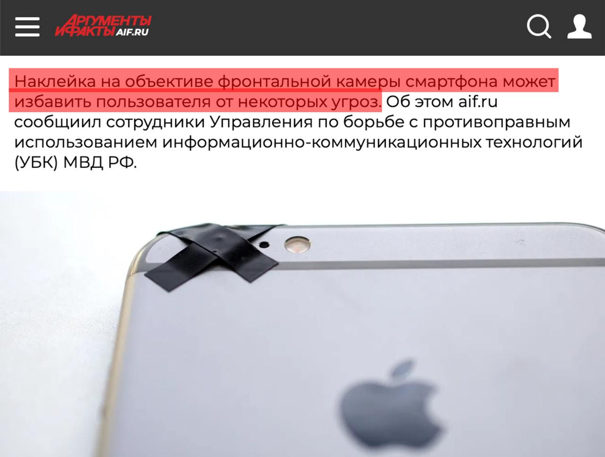 Наклейка на объективе фронтальной камеры смартфона может избавить пользователя от некоторых угроз. Об этом aif.ru сообщили сотрудники Управления по борьбе с противоправным использованием информационно-коммуникационных технологий (УБК) МВД РФ.