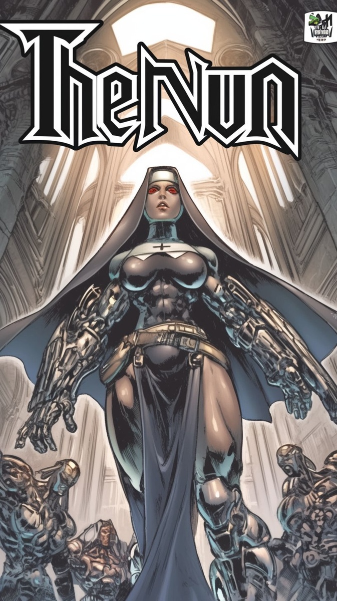 Создано на основе запроса: old comic book cover, "The Nun" upper big title, beautiful witchblade warrior vampire, nun vampiress character looking up, retrofuturistic film noir, glowing incandescent eyes with red spectacles, in the style of neon hallucinations, mecha anime, arched doorways, animated gifs, dark white and sky-blue, flat areas of color, halftone, alois arnegger quality details