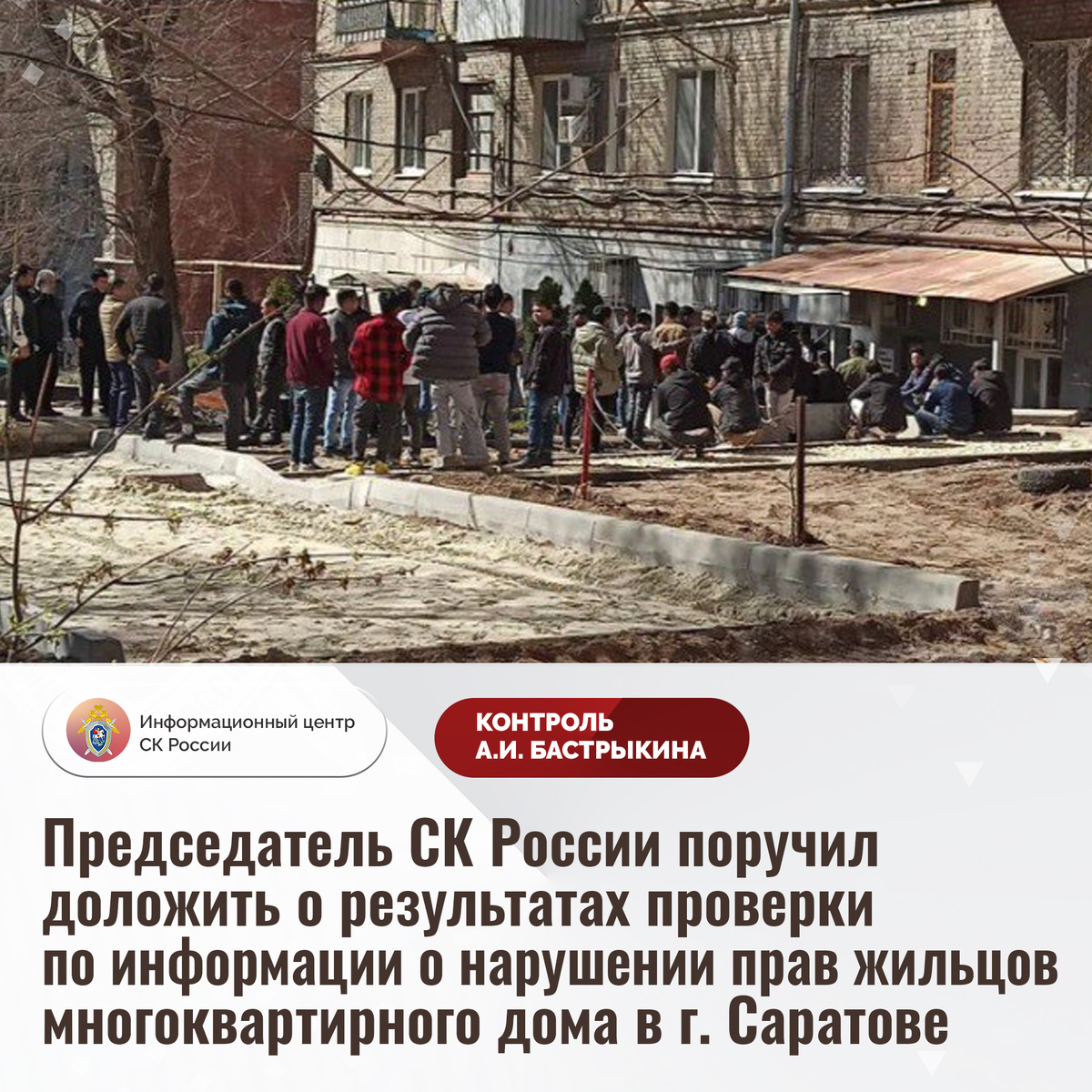 Председатель СК России поручил доложить о результатах проверки по информации о нарушении прав жильцов многоквартирного дома в г. Саратове В СМИ сообщается, что в многоквартирном доме по улице Горького в городе Саратове функционирует центр по тестированию мигрантов, при этом вход в учреждение расположен во дворе вблизи детской площадки. Иностранные граждане систематически нарушают общественный порядок, не соблюдают санитарные нормы и проявляют агрессию в адрес местных жителей. Граждане опасаются за свою безопасность, а также за жизнь и здоровье детей. Многочисленные обращения результатов не принесли. В СУ СК России по Саратовской области по данному факту организована процессуальная проверка. Председатель Следственного комитета Российской Федерации Александр Иванович Бастрыкин поручил руководителю СУ СК России по Саратовской области Дмитрию Александровичу Костину доложить о промежуточных результатах процессуальной проверки и о принятом по итогам решении. Исполнение поручения, а также ход