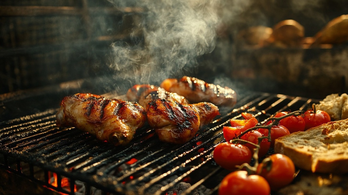 Создано на основе запроса: realistic photo of grilled chicken on barbecue grill, crispy golden crust, roasted bell peppers and tomatoes beside the meat, grilled bread brushed with olive oil, smoke rising gently, outdoor setting with rustic vibes, summer daylight, high detail --- Автоперевод: Реалистичная фотография курицы на гриле на гриле для барбекю, хрустящей золотой коры, жареного сладкого перца и помидоров рядом с мясом, жареный хлеб с оливковым маслом, мягко поднимаясь, на открытом воздухе с деревенским вибрация Как тебе генерация? 🤔 https://dzen.ru/id/65c0c65c86e4f837c27b24d7 #ИИ #AI #нейросеть #midjourney #art