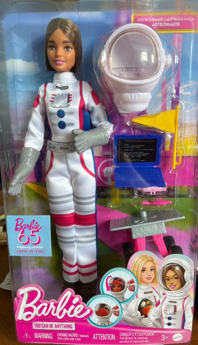 Сегодня 12 апреля, День космонавтики, с чем я вас всех, мои дорогие читатели, и поздравляю. Это важный и классный праздник, ведь он учит нас мечтать и видеть, что нет ничего невозможного, ну и ,конечно, напоминает нам о том, что у нас есть, чем гордиться. Наверное, сложно придумать лучшей даты, чтобы распаковать новую Барби - космонавта. Давайте сделаем это вместе. Я даже рискнула и создала свой первый в жизни видеоролик с распаковкой. Забегая вперед скажу, что там есть самый любимый звук многих коллекционеров - звук разрезаемой лески, а также нелюбимый многими звук залаченной кукольной шевелюры 😂 Итак, начнем. В этом юбилейном выпуске Барби-космонавтом стала Джойс (она же Нью Тереза, она же Нейса). На передней части коробки мы, помимо самой куклы и всех прилагающихся к ней аксессуаров, можем видеть интересный арт, с самой Джойс и ее подругой, которая выпускалась на молде Милли в похожем костюме космонавта. Теперь давайте посмотрим на заднюю крышку коробки. Здесь главный интерес п